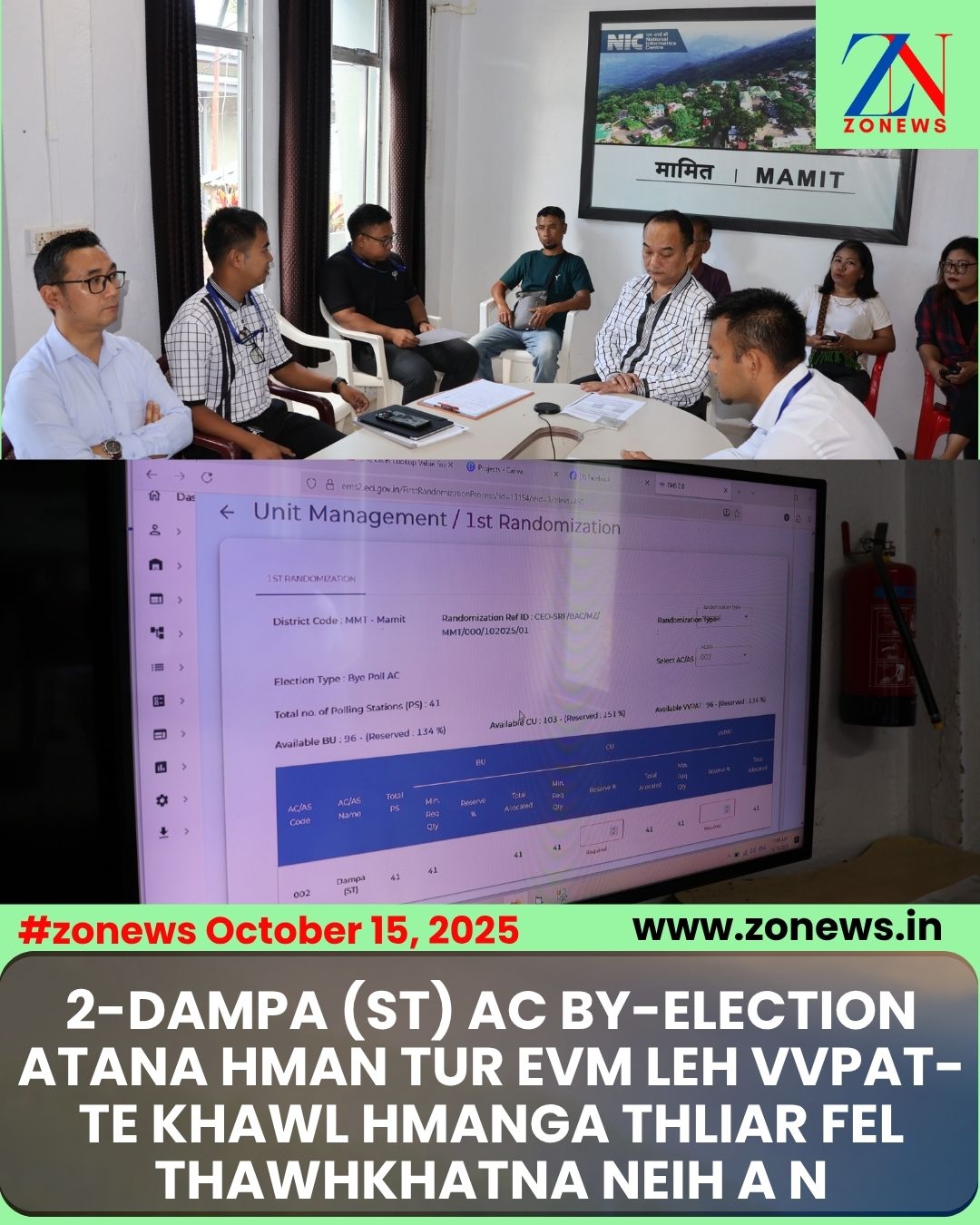 #ZONEWS Mamit October 15, 2025 : 2-Dampa (ST) AC By – Election neih tura inpuahchahna kal mekah vawiin khan 1st Randomisation of EVM & VVPAT chu Pu K.Laltlawmlova, District Election Officer hova neih a ni a. 2-Dampa (ST) AC chhunga By-Election a EVM leh VVPAT hman turte khawl hmanga thliar fel a ni.