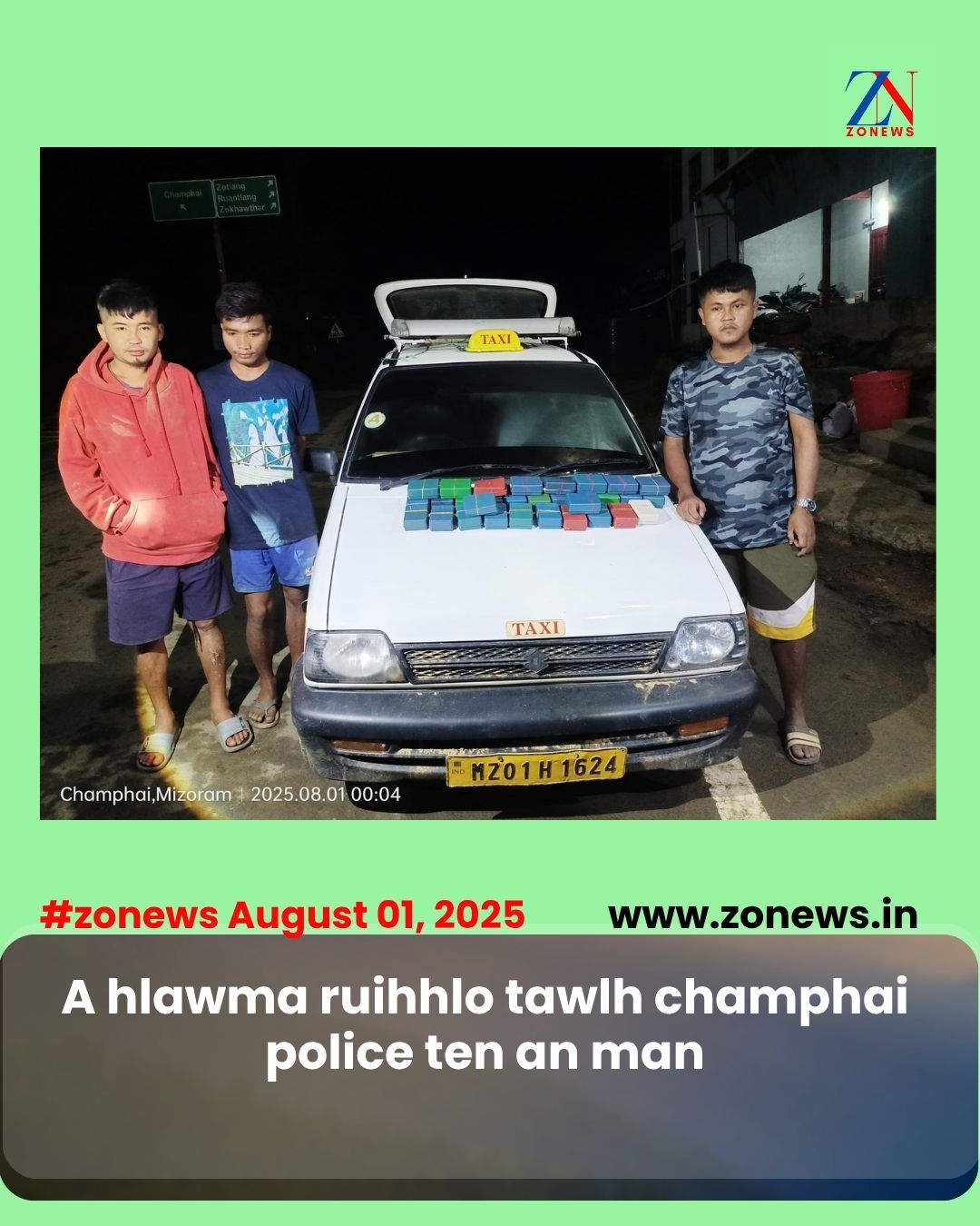 #ZONEWS August 01, 2025: Nizan dar 11:50 khan Champhai atanga Aizawl pan tur Taxi pakhat chu Champhai Police checkgate-ah endik niin Taxi kawngkhar chhunga thuhruk Heroin Hawng 31, Gram 364 a rit an man a.