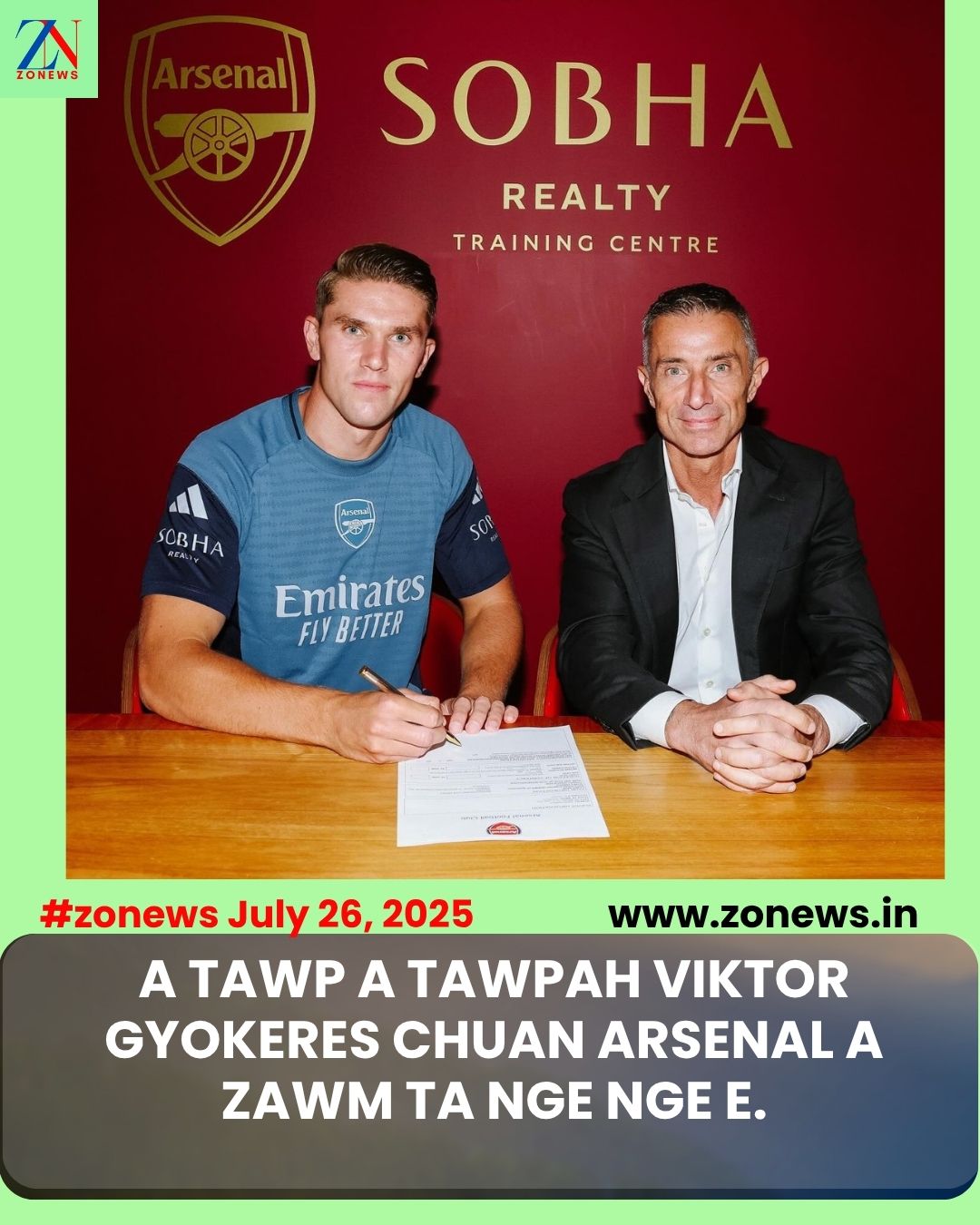 #ZONEWS July 26, 2025: Rei tak chhung an inchhai a. A lut dawn, a lut leh dawn lo. Tunkarah an sign dawn tihvelte a ni thin. Tunah erawh a chiang tak tak ta. Arsenal thu chhuah chuan, “Viktor Gyokeres chuan Arsenal-ah rei tak chhung cham turin contract a ziak fel ta,” tiin an chhuah a ni. He striker goal thun thei zet mai signature nei tur hian Sporting Lisbon hnenah Arsenal hian 73m euros (£63m) an pe a ni.
