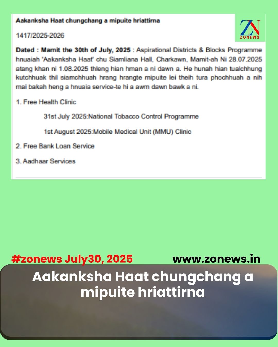 #ZONEWS July 30, 2025 : Aspirational Districts & Blocks Programme hnuaiah ‘Aakanksha Haat’ chu Siamliana Hall, Charkawn, Mamit-ah Ni 28.07.2025 atang khan ni 1.08.2025 thleng hian hman a ni dawn a. He hunah hian tualchhung kutchhuak thil siamchhuah hrang hrangte mipuite lei theih tura phochhuah a nih mai bakah heng a hnuaia service-te hi a awm dawn bawk a ni.