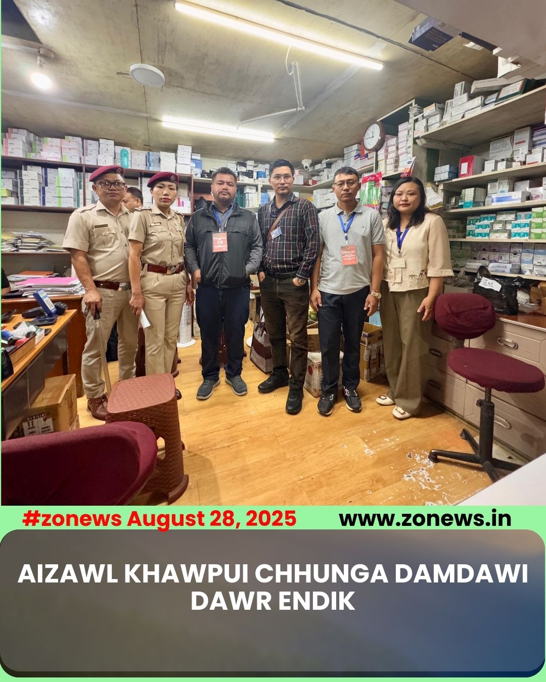 AIZAWL,the 28th August,2025: Aizawl District Magistrate Er. Lalhriatpuia, IAS in naupang kumtling lo leh School Uniform ha ten damdawi ruih nana hmanchi an lei tur ven nana damdawi dawr (heng damdawi kawl pha chin) te chuan an dawrah damdawi leitu te lang thei ngei tura CCTV vuah vek tur a nih thu Order a lo siam tawh bawhzuiin vawiin khan khan Pu John Lalramhluna Hnamte, Executive Magistrate hovin FDA(H&FW Department) atangin Drugs Inspector leh Police Department te tangkawp chuan Joint Inspection an nei. He inspection-ah hian Civil Hospital, Aizawl chhehvel-a Pharmacy 64 te endik an ni a, a tlangpuiin Pharmacy te hian District Magistrate thuchhuak hi an zawm tha hle. Amaherawhchu, heng Pharmacy zinga 7 te hian CCTV hi an la vuah(installed) lova, heng mite chungah hian a tul anga hmalak chhunzawm a ni dawn a ni.