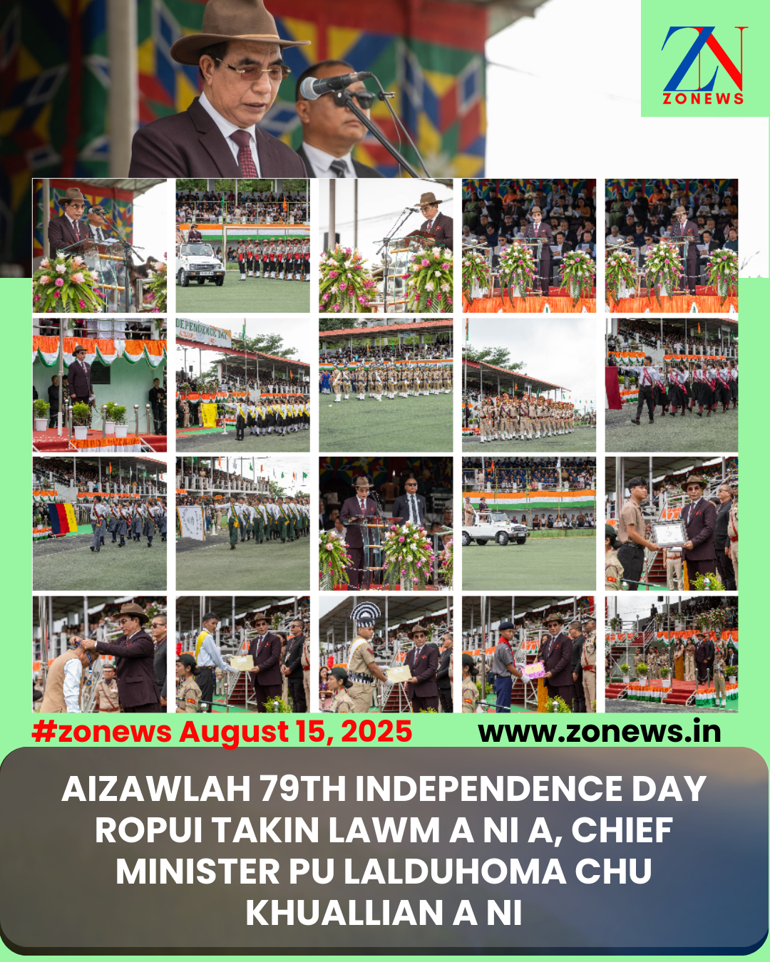 #ZONEWS Aizawl August 15, 2025: Vawiin khan Aizawl Lammualah India ramin zalenna a hmuh champha vawi 79-na lawm a ni a. Khuallian Pu Lalduhoma, Chief Minister chuan Hnam Puanzar pawt pharhin Parade Contingent te chibai bukna a chhanglet.