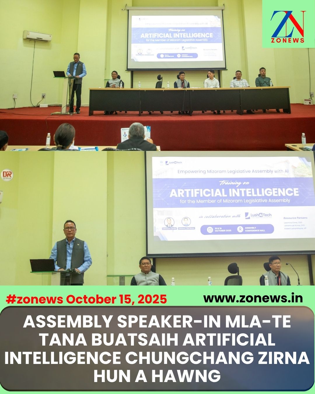 #ZONEWS Aizawl October 15, 2025: Mizoram Legislative Assembly Speaker Pu Lalbiakzama chuan vawiin khan Assembly Conference Hall-ah Mizoram Legislative Assembly Member-te tana buatsaih, ni hnih chhung Artificial Intelligence (AI) chungchang zirna hun, ‘Empowering Mizoram Legislative Assembly with AI: Training on Artificial Intelligence for the Members of Mizoram Legislative Assembly’ chu a hawng.