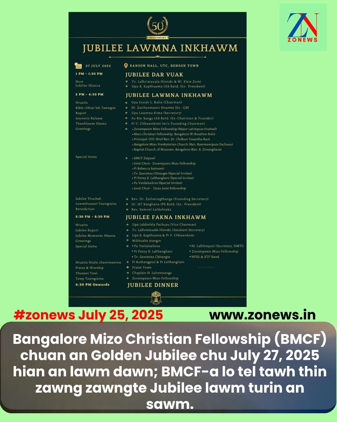 #ZONEWS Bangalore July 25, 2025: Bangalore Mizo Christian Fellowship (BMCF) chuan an Golden Jubilee chu July 27, 2025 hian an lawm dawn a. Mizo Pathian fakna hla satute kan neih that tak tak, Pu Vanlalsailova, Pi Pensy B. Lalthangliani, Tv. Lalmalsawma (Sawmtea) leh Nl. Lalhlimpuii ten an hmanpui dawn a ni.