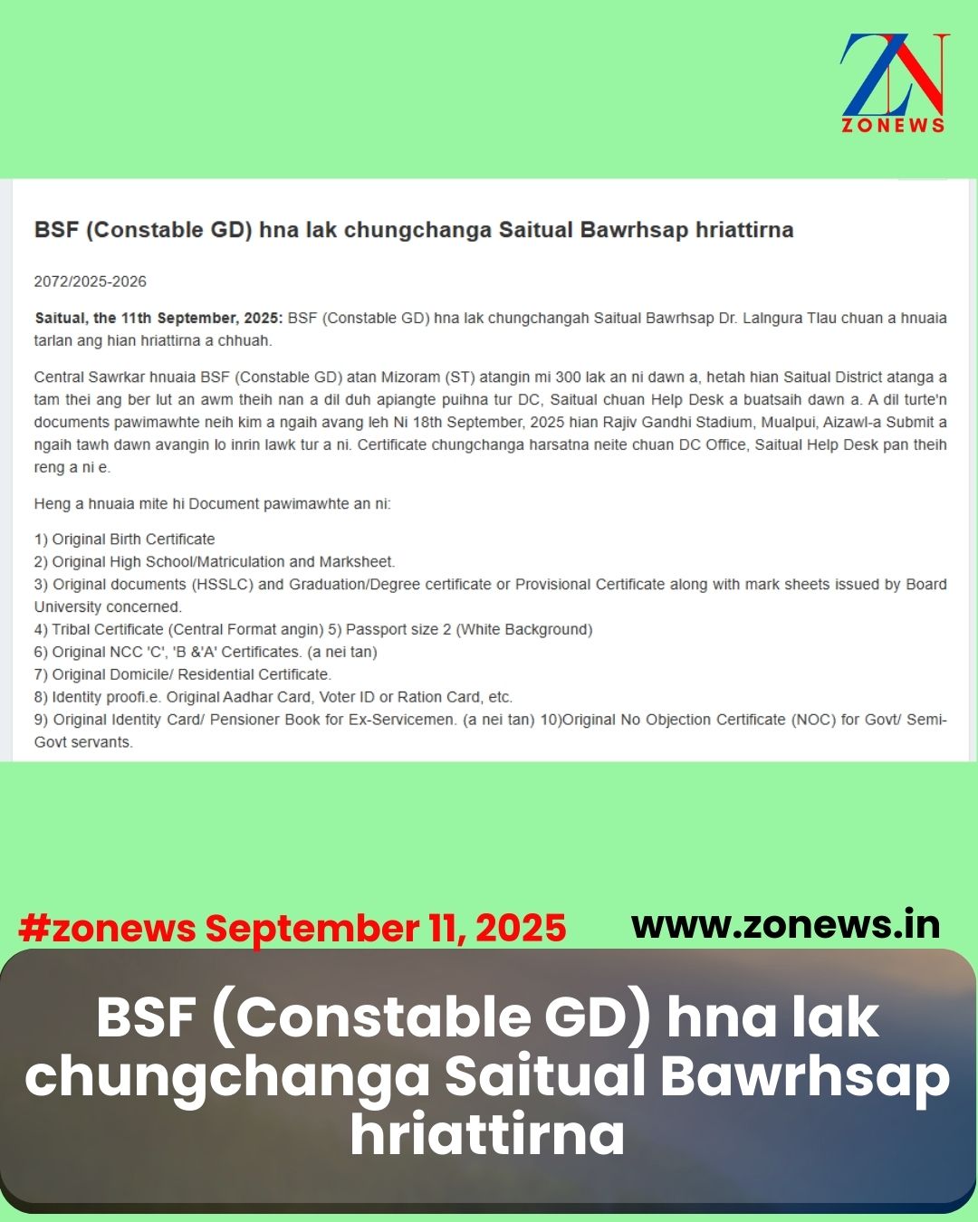 Central Sawrkar hnuaia BSF (Constable GD) atan Mizoram (ST) atangin mi 300 lak an ni dawn a, hetah hian Saitual District atanga a tam thei ang ber lut an awm theih nan a dil duh apiangte puihna tur DC, Saitual chuan Help Desk a buatsaih dawn a. A dil turte’n documents pawimawhte neih kim a ngaih avang leh Ni 18th September, 2025 hian Rajiv Gandhi Stadium, Mualpui, Aizawl-a Submit a ngaih tawh dawn avangin lo inrin lawk tur a ni. Certificate chungchanga harsatna neite chuan DC Office, Saitual Help Desk pan theih reng a ni e.