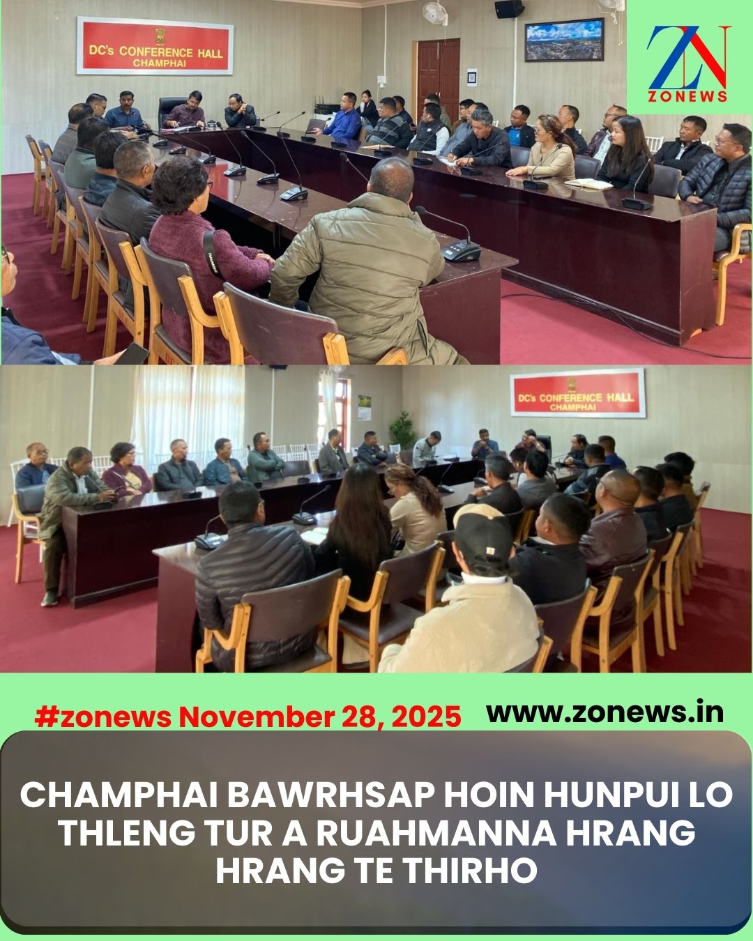 #ZONEWS Champhai December 28, 2025: Vawiin khan Champhai Bawrhsap Conference Hall-ah Bawrhsap Pu Mohammad Aaquib-a kaihhruaiin kan hma lawka Krismas leh kumthar hun pui lo thleng tur thlirhoin thutkhawm neih a ni a. He hunah hian Champhai SP Pu Lokeshwaran R leh a kaihhnawih sawrkar pisa aiawhte bakah khawpui chhung Village Council, Sub-Hqrs YMA, MJA leh Champhai District Dawrkai Association aiawh te an tel a ni.
