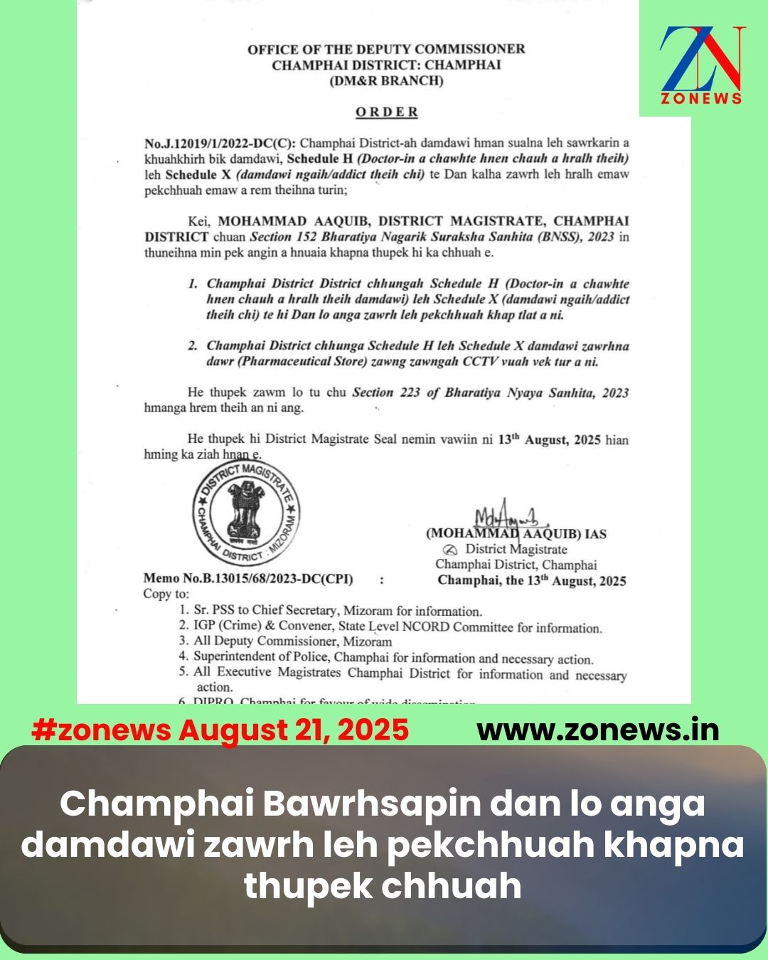 #ZONEWS Champhai August 21, 2025: Champhai Bawrhsap Pu Mohammad Aaquib chuan Schedule H leh Schedule X damdawi dan lo anga zawrh leh pek chhuah khapna thupek hetiang hian a chhuah: