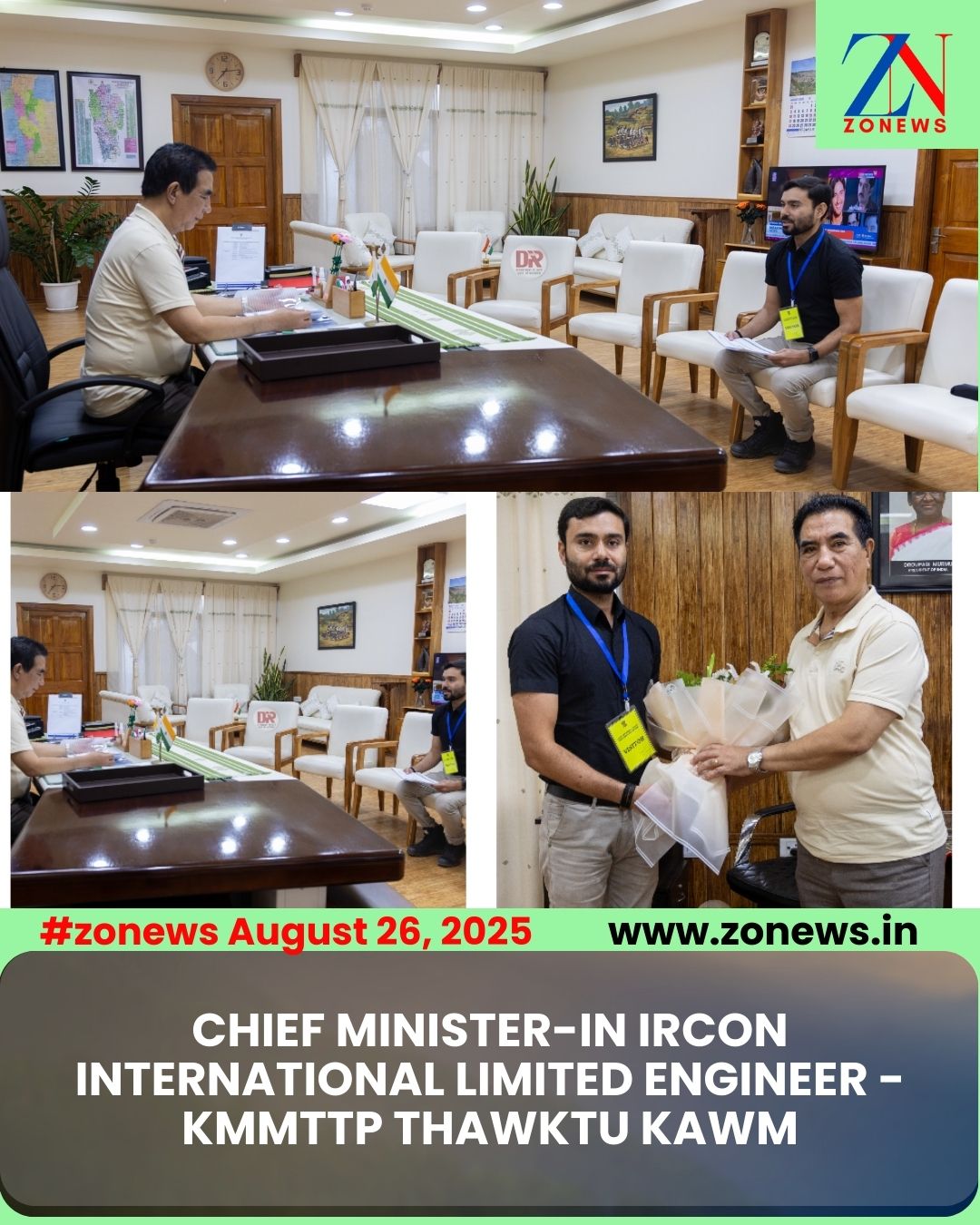 #ZONEWS Aizawl August 26, 2025: Vawiin khan Chief Minister Pu Lalduhoma chuan a office-ah KMMTTP Zorinpui leh Paletwa inkar thawh mek enkawltu Deputy Project Engineer Pu Nazish Akhtar a kawm a. An harsatnate a ngaihthlaksak.