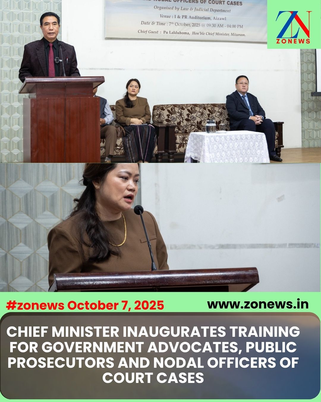 #ZONEWS Aizawl, October 7, 2025: Chief Minister Pu Lalduhoma today inaugurated the Training for Government Advocates, Public Prosecutors and Nodal Officers of Court Cases organised by the Law & Judicial Department at the I&PR Auditorium, Aizawl.