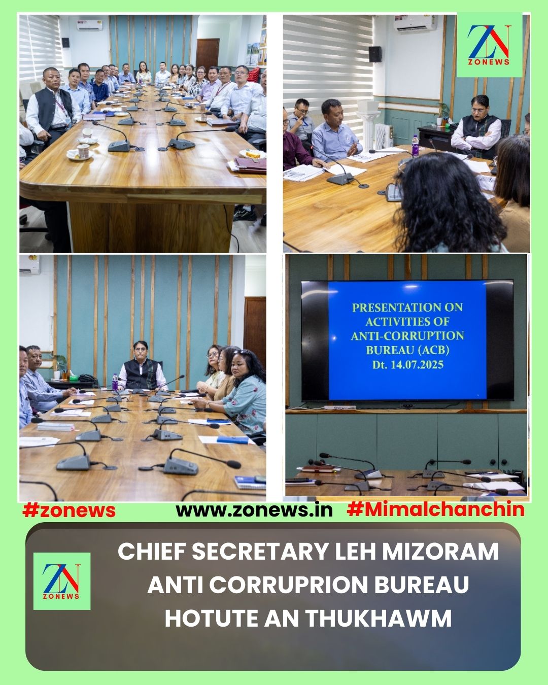#ZONEWS July 14, 2025: Vawiin khan Chief Secretary cum Chief Vigilance Officer Pu Khilli Ram Meena hovin Mizoram Anti-Corruption Bureau hotute chu Chief Secretary Conference Hall, MINECO-ah an thukhawm a, Mizorama ACB hnathawh kal mekte leh tun hnaia ACB hmasawnna leh hmalakna hrang hrangte an sawi ho.