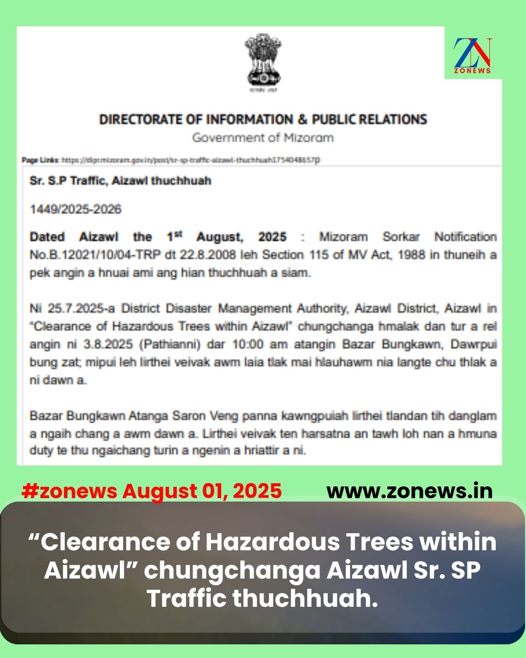 Ni 25.7.2025-a District Disaster Management Authority, Aizawl District, Aizawl in “Clearance of Hazardous Trees within Aizawl” chungchanga hmalak dan tur a rel angin ni 3.8.2025 (Pathianni) dar 10:00 am atangin Bazar Bungkawn, Dawrpui bung zat; mipui leh lirthei veivak awm laia tlak mai hlauhawm nia langte chu thlak a ni dawn a.