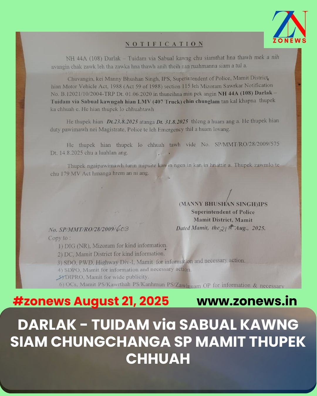 Chuvangin, Pu Manny Bhushan Singh, IPS, Superintendent of Police, Mamit District chuan Motor Vehicle Act, 1988 (Act 59 of 1988) section 115 leh Mizoram Sawrkar Notification No. B.12021/10/2004-TRP Dt. 01.06.2020 in thuneihna a pek angin NH 44A (108) Darlak -Tuidam via Sabual kawngah hian LMV (407 Truck) chin chunglam tan kal khapna thupek a chhuah.