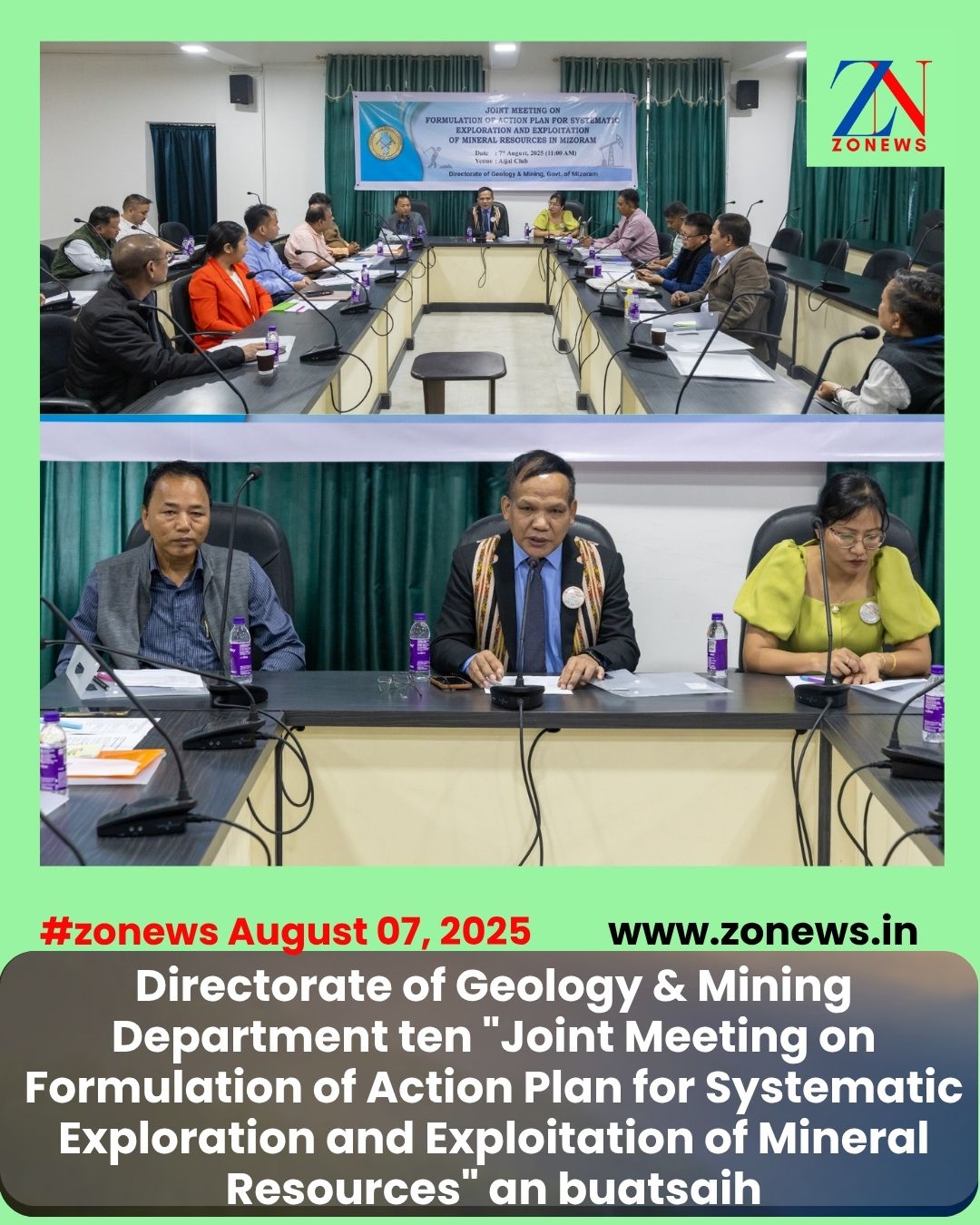#ZONEWS Aizawl August 07, 2025 : Directorate of Geology & Mining, Mizoram chuan ni 7 August 2025 khan Aijal Club, Aizawl-ah “Joint Meeting on Formulation of Action Plan for Systematic Exploration and Exploitaion of Mineral Resources” a buatsaih a. State chhunga leilung hausakna mumal taka zawn chhuah leh hman tangkai dan tur Action Plan kimchang tak siam a ni a. Meeting-ah hian Geological Survey of India (GSI), Oil India Limited, CMPDI, leh technical agency dangte aiawh pawimawh tak tak an tel bawk.