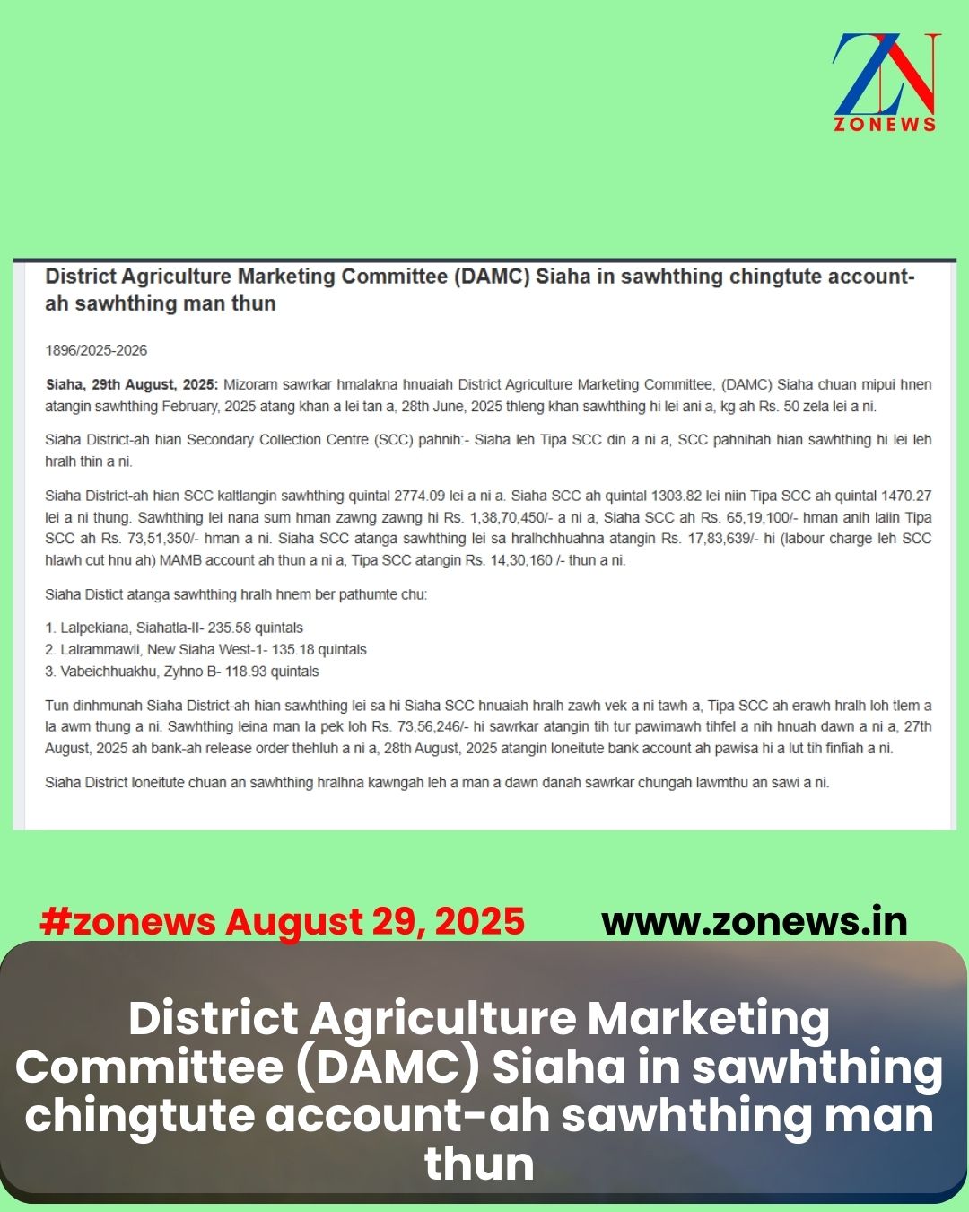 #ZONEWS Siaha August 29, 2025: Mizoram sawrkar hmalakna hnuaiah District Agriculture Marketing Committee, (DAMC) Siaha chuan mipui hnen atangin sawhthing February, 2025 atang khan a lei tan a, 28th June, 2025 thleng khan sawhthing hi lei ani a, kg ah Rs. 50 zela lei a ni.
