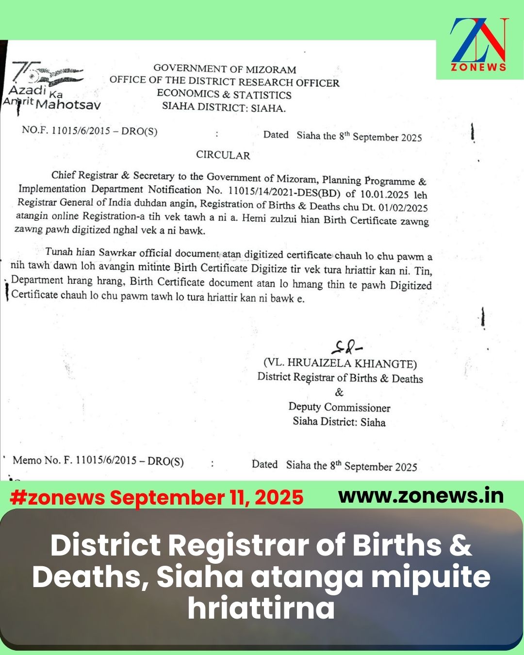 #ZONEWS Siaha September 11, 2025: District Registrar of Births & Deaths leh District Bawrhsap nibawk Pu VL Hruaizela Khiangte chuan Birth Certificate digitized chungchangah Siaha District mipuite tan a hnuai tarlan ang hian hriattirna a chhuah.