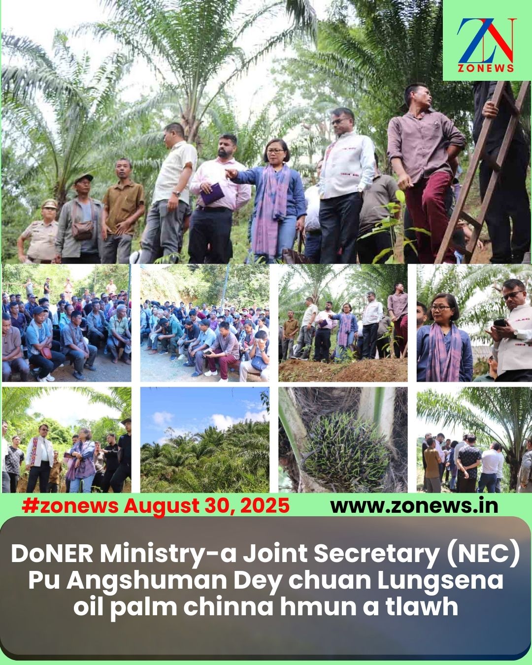#ZONEWS Lunglei August 30, 2025: Sawrkar laipui Ministry of Development of North Eastern Region (DoNER)-a Joint Secretary (NEC) Pu Angshuman Dey chuan vawiin khan Lunglei District chhung Lungsen khuaa oil palm chinna hmun (plantation) te a hmunah tlawhin, oil palm chingtute harsatna leh mamawh hrang hrang a enpui.