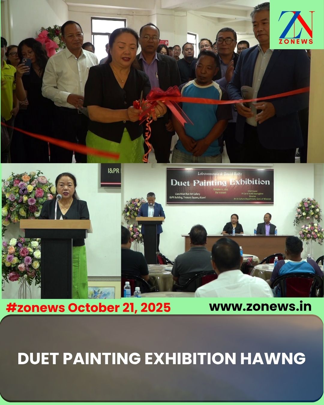 #ZONEWS Aizawl, October 21, 2025 : Pu David Ralte, Champhai Ruantlang leh Pu Lalrammawia, Durtlang North te lemziak phochhuahna “Duet Painting Exhibition” chu Art & Culture Director Pi Carol VLMS Dawngkimi’n mipui tlawh theih turin vawiin khan DIPR Lianchhiari Run Conference Hall, Treasury Square-ah a hawng.