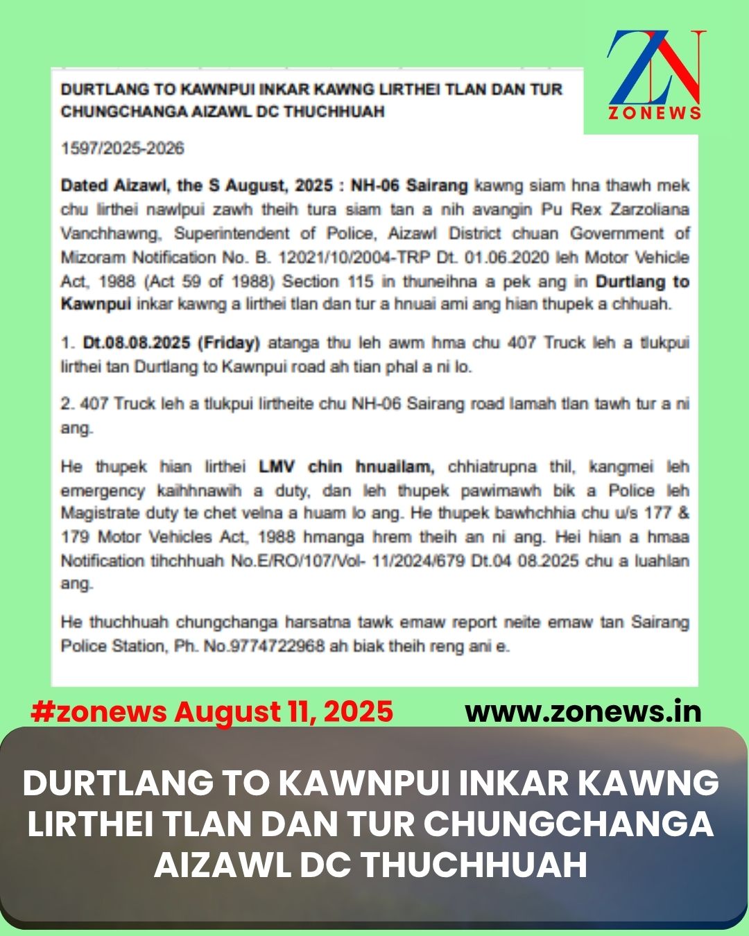 #ZONEWS Aizawl August 11, 2025 : NH-06 Sairang kawng siam hna thawh mek chu lirthei nawlpui zawh theih tura siam tan a nih avangin Pu Rex Zarzoliana Vanchhawng, Superintendent of Police, Aizawl District chuan Government of Mizoram Notification No. B. 12021/10/2004-TRP Dt. 01.06.2020 leh Motor Vehicle Act, 1988 (Act 59 of 1988) Section 115 in thuneihna a pek ang in Durtlang to Kawnpui inkar kawng a lirthei tlan dan tur a hnuai ami ang hian thupek a chhuah.