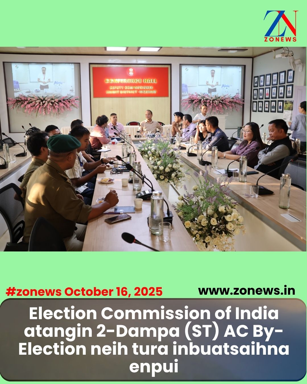 #ZONEWS Mamit October 16, 2025 : Vawiin khan 2-Dampa (ST) AC By-Election neihna tura inbuatsaihna hrang hrang enpuiin Sh.Vibhor Agrawal, Under Secretary leh Sh.Hemant, Assistant Section Officer, Election Commission Of India te chuan District Election Office Mamit an tlawh a, Pu K.Laltlawmlova, District Election Officer kaihruainain DC Conference Hall, Mamit-ah, SP Mamit, RO, ARO leh Nodal Officers te nen meeting neih a ni.