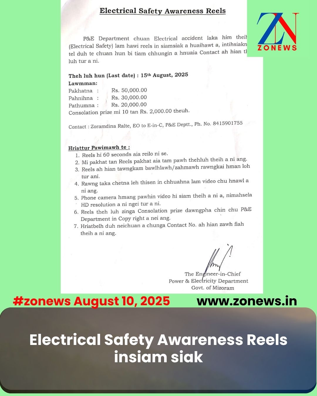 #ZONEWS August 10,2025:P&E Department chuan Electrical accident laka him theihna (Electrical Safety) lam hawi reels in siamsiak a huaihawt a, intihsiakna a tel duh te chuan hun bi tiam chhungin a hnuaia Contact ah hian theh luh tur a ni.