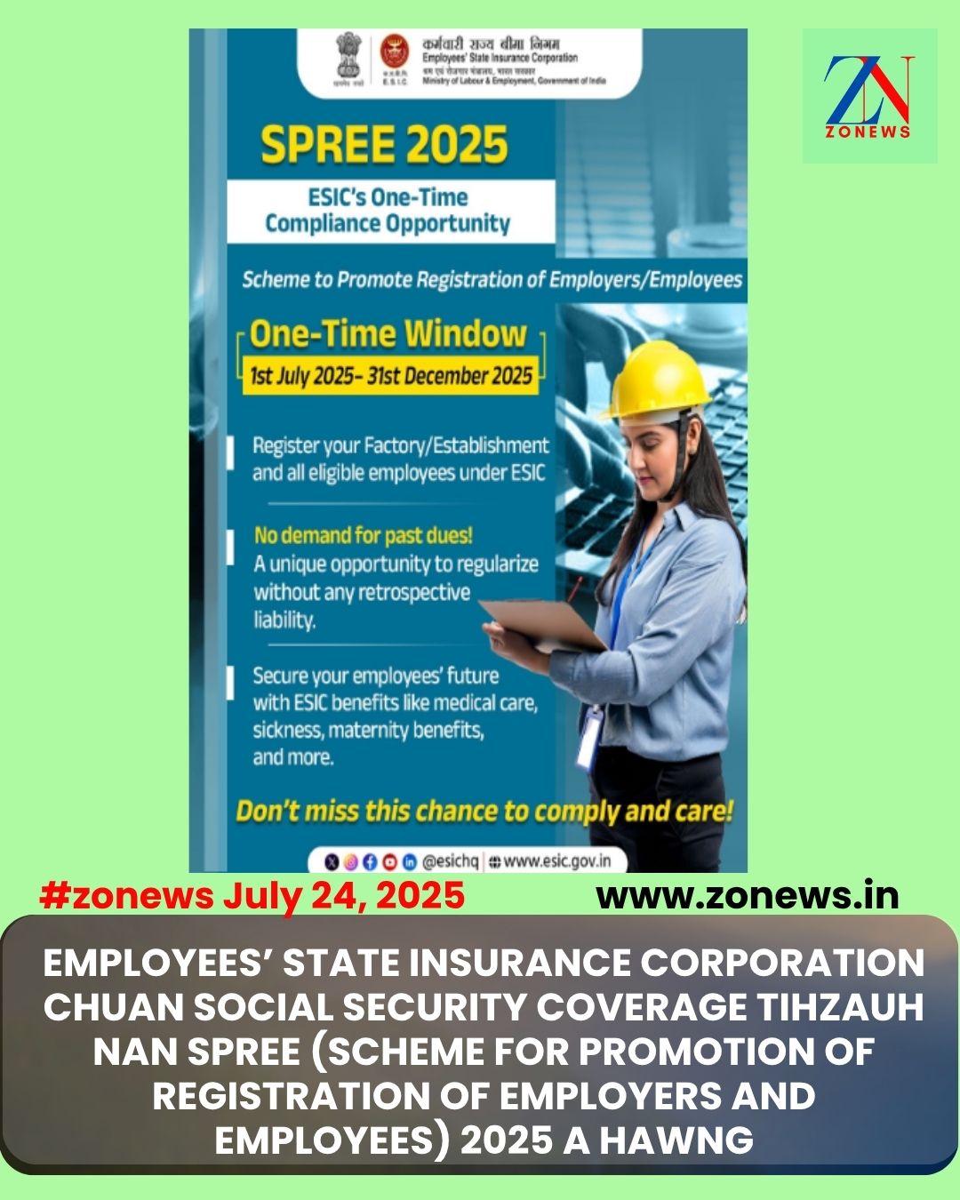 Employees’ State Insurance Corporation (ESIC)-in a pawmpui SPREE 2025 hi ESI Act hnuaia social security coverage tihpun tumna bik a ni. He scheme hi 1st July atanga 31st December 2025 thleng hman a ni dawn a, contractual leh temporary’ worker telin chhawrtu (employer) leh hnathawktu (employee) in ziaklut lo te tan -inspection emaw, past dues mamawhna emaw hmachhawn lovin inziak lut turin vawi khat hun remchang a siamsak a ni.