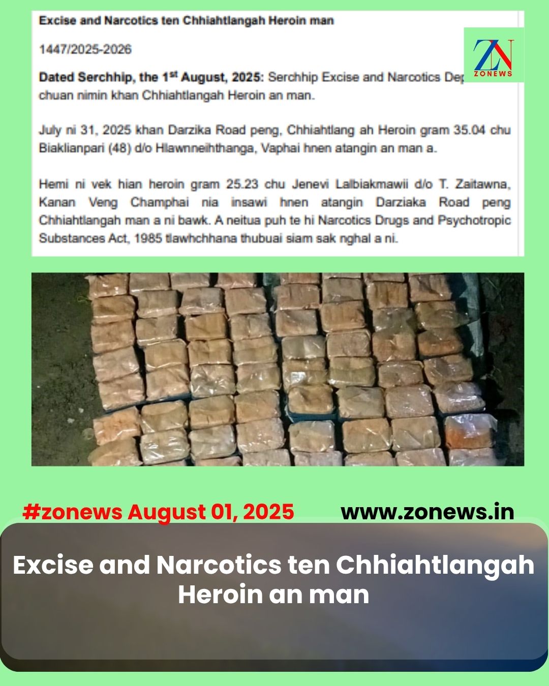 #ZONEWS Serchhip August 01, 2025: Serchhip Excise and Narcotics Department chuan nimin khan Chhiahtlangah Heroin an man.