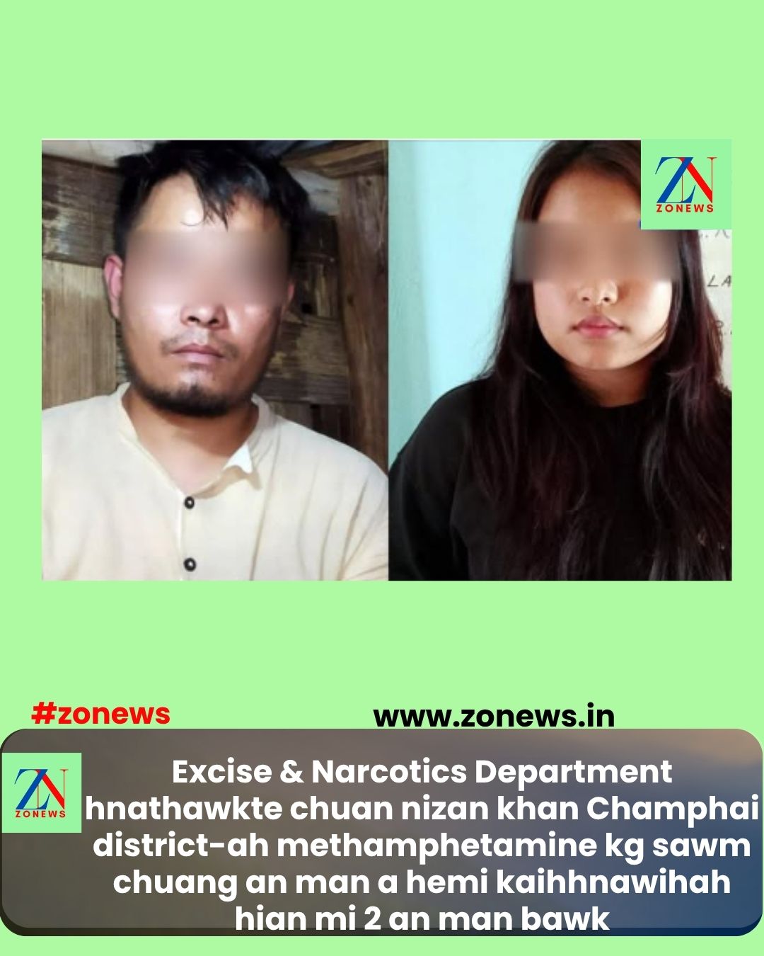 #ZONEWS July 20, 2025: Excise & narcotics department thupuangtu Pu Peter Zohmingthanga’n a sawi danin nizan dar 11:10 khan Champhai District-a Zokhawthar khaw panna bul, New Hruaikawn kawngah Methamphetamine Kg 10 leh Gram 100 (mum nuai 1 leh sang khat) leh a neitu nia puh – Lunminlalzo (34) Churachandpur, Manipur, tuna Champhai Vengthara khawsa mek nia inchhal chu an man.