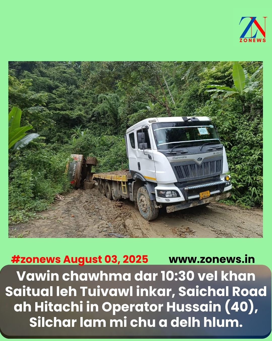 #ZONEWS #ZUALKO August 03, 2025: Vawin chawhma dar 10:30 vel khan Saitual leh Tuivawl inkar, Saichal Road ah Hitachi in Operator Hussain (40), Silchar lam mi chu a delh hlum.