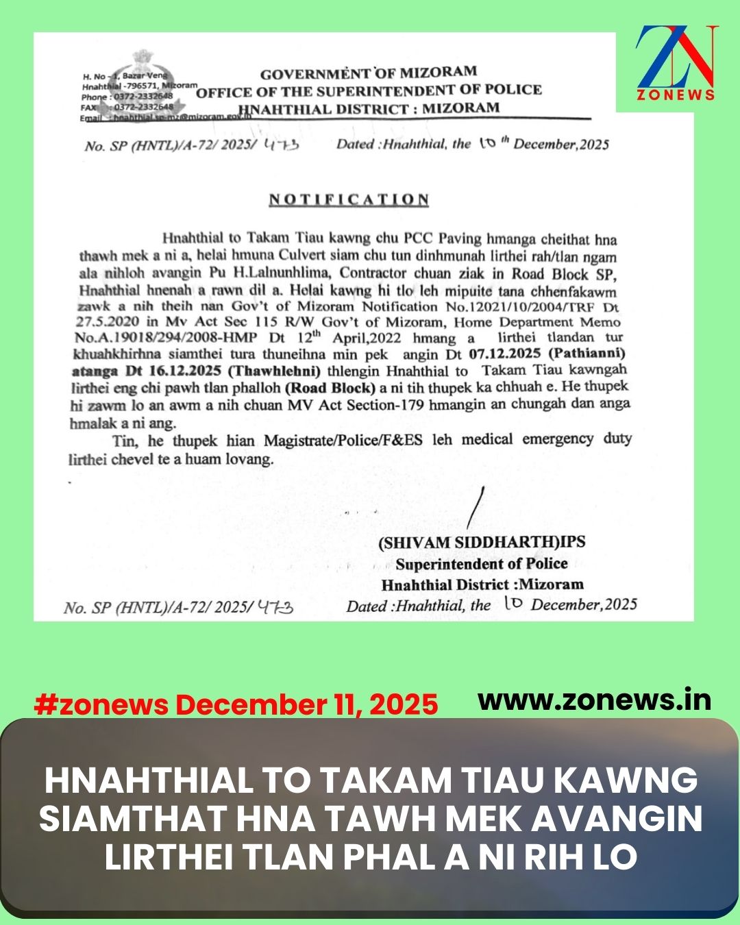 Hnahthial to Takam Tiau kawng chu PCC Paving hmanga cheithat hna thawh mek a ni a, helai hmuna Culvert siam chu tun dinhmunah lirthei rah/tlan ngam a la nihloh avangin Pu H.Lalnunhlima, Contractor chuan ziak in Road Block SP, Hnahthial hnenah a rawn dil a. Helai kawng hi tlo leh mipuite tana chhenfakawm zawk a nih theih nan Gov’t of Mizoram Notification No.12021/10/2004/TRF Dt 27.5.2020 in MV Act Sec 115 R/W Gov’t of Mizoram, Home Department Memo No. A.19018/294/2008-HMP Dt 12h April,2022 hmang a lirthei tlandan tur khuahkhirhna siamthei tura thuneihna min pek angin Dt 07.12.2025 (Pathianni) atanga Dt 16.12.2025 (Thawhlehni) thlengin Hnahthial to Takam Tiau kawngah lirthei eng chi pawh tlan phalloh (Road Block) a ni tih thupek ka chhuah e. He thupek hi zawm lo an awm a nih chuan MV Act Section-179 hmangin an chungah dan anga hmalak a ni ang.