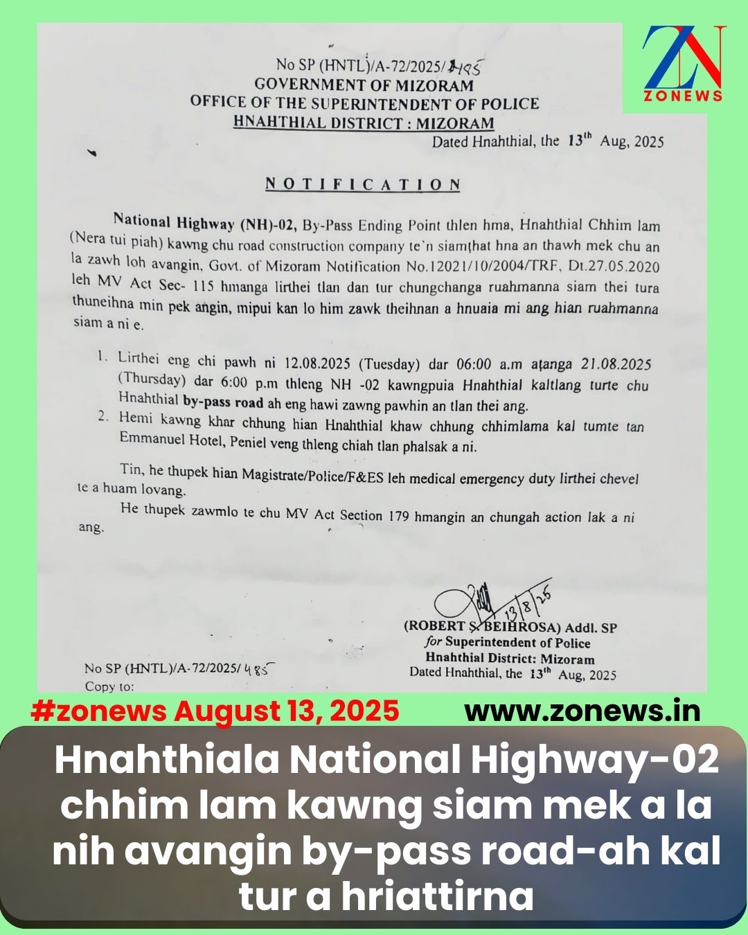#ZONEWS Hnahthial August 13, 2025: Chhim lama National Highway -02 leh bypass inzawmna kawng chu siam mek a nih avangin 12.08.2025 (Tuesday) zing dar 6 atanga 21.08.2025 (Thursday), tlai dar 6 thleng chu hemi kawnga kal tumte tan by pass road ah tlan tur a nih thu Addl SP, Pu Robert S Behrosa chuan thupek a chhuah.