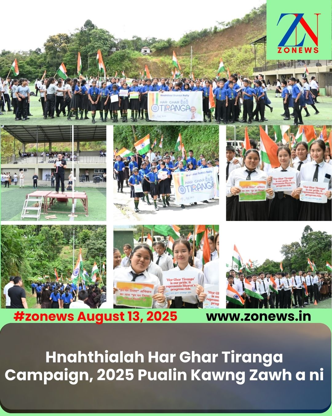 #ZONEWS Hnahthial August 13, 2025: Vawiin khan India hnam puanzar pawimawhna leh hlutna inzirtirna – Har Ghar Tiranga Campaign pualin Hnahthial-a school zirlaiten HDFA Turf ground atanga Nauhruaikawn thleng kawng an zawh a. Kawng zawh tawpna hmunah hian Addl DC, Pu Zothanmawia Khiangte chuan Har Ghar Tiranga hman a nih chhan sawifiahna hun a hmang a ni.