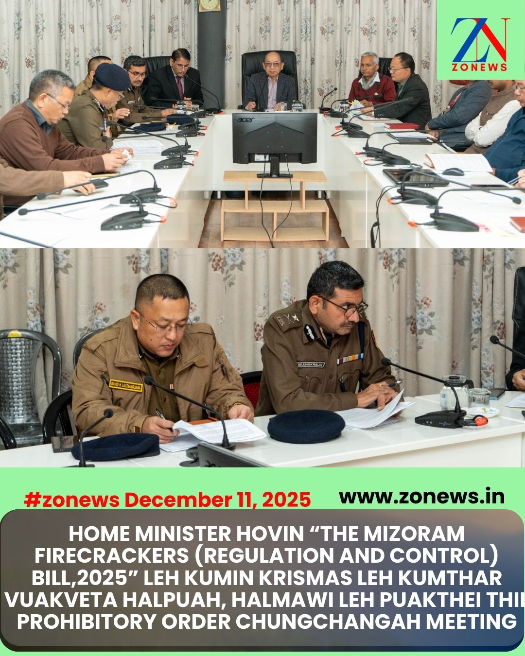 #ZONEWS AIZAWL December 11, 2025: Vawiin khan Home Minister Pu K.Sapdanga hovin Secretariat Conference Hall-II, MINECO- ah kumin Krismas leh kumthar vuakveta halpuah, halmawi leh puakthei thil khapna thupek (Prohibitory order)  leh “The Mizoram Firecrackers (Regulation & Control) Bill, 2025” chungchangah meeting neih a ni.
