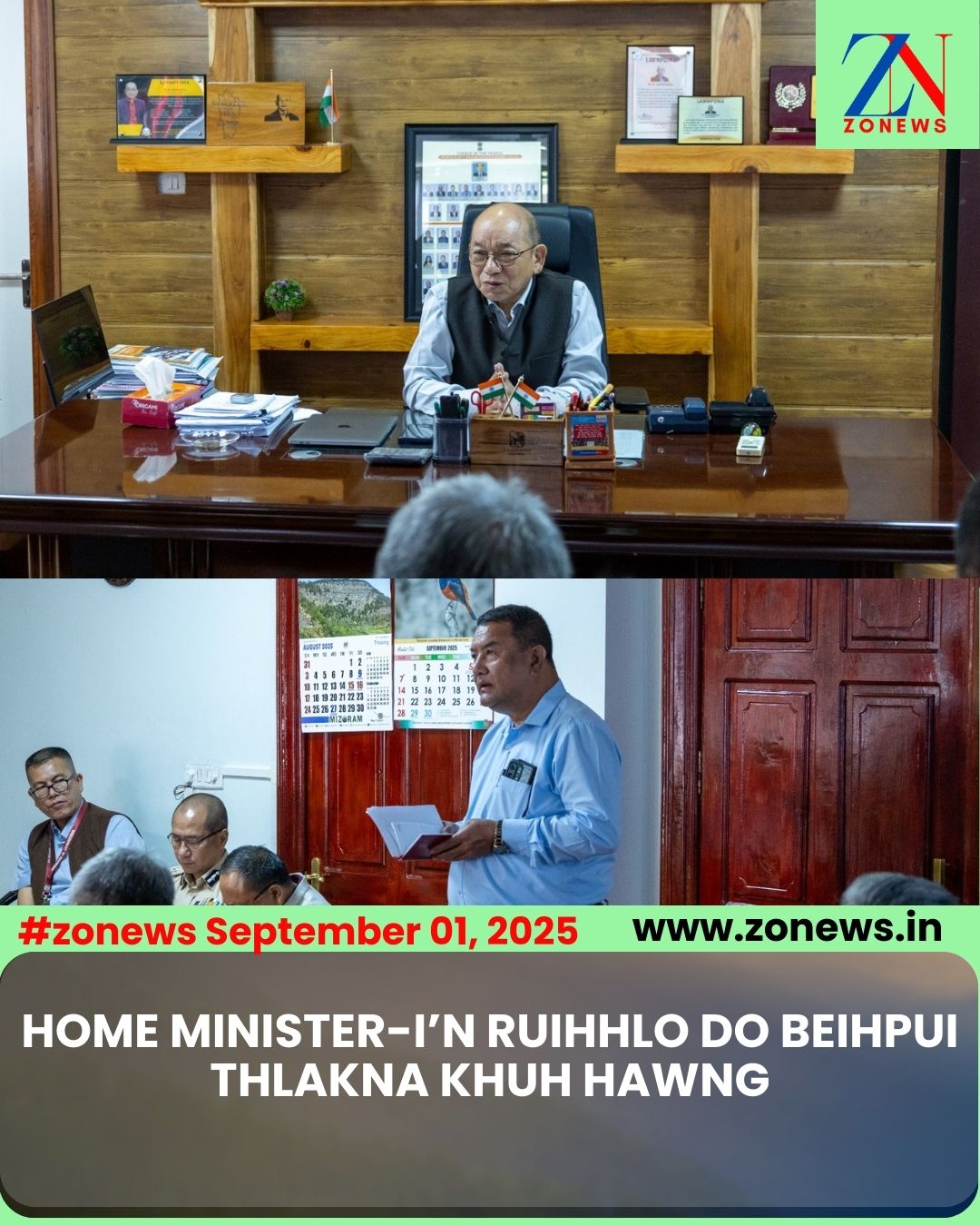 #ZONEWS Aizawl September 1, 2025 : Home Minister Pu K. Sapdanga’n vawiin khan a pisaah Mizorama ruihhlo do beihpui thlakna tur khuh hawnna a nei. He hunah hian Excose & Narcptics Minister Pu Lalnghinglova Hmar, Home Department Secretary, IGP (L&0), Aizawl DC leh SP bakah Excise & narcotics leh Polkicve hotu pawimawhte an tel a, Central YMA hruaitute pawh an tel a ni.