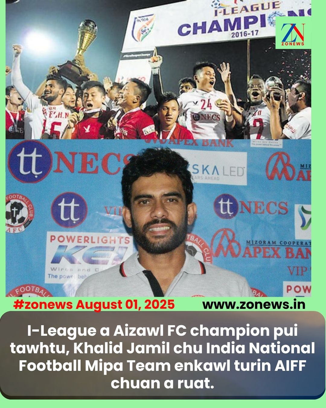 #ZONEWS August 01, 2025: India ramin coach kan neih that berte zing a mi leh, I-League leh ISL-ah pawh tawn hriat ngah em em mai. I-League a Aizawl FC champion pui tawhtu, Khalid Jamil chu India National Football Mipa Team enkawl turin AIFF chuan a ruat.