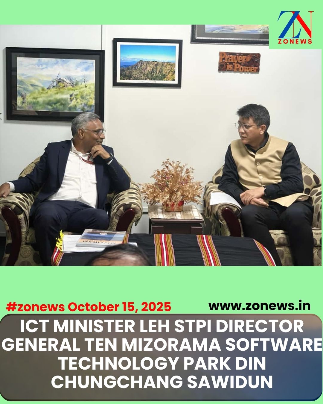 #ZONEWS Aizawl October 15, 2025 : Vawiin khan Information & Communication Technology Minister Dr. Vanlalthlana leh Software Technology Parks of India (STPI) Director General Pu Arvind Kumar te chu Minister pisa-ah inkawmin, changtlung leh chak zawka Mizorama STPI din a nih theih dan tur chungchang an sawidun a; Director General hi Ministry of Electronics and Information Technology Minister Pu Ashwini Vaishnaw-a leh Mizoram ICT Minister te indawrna bawhzuia Mizorama rawn kal a ni.