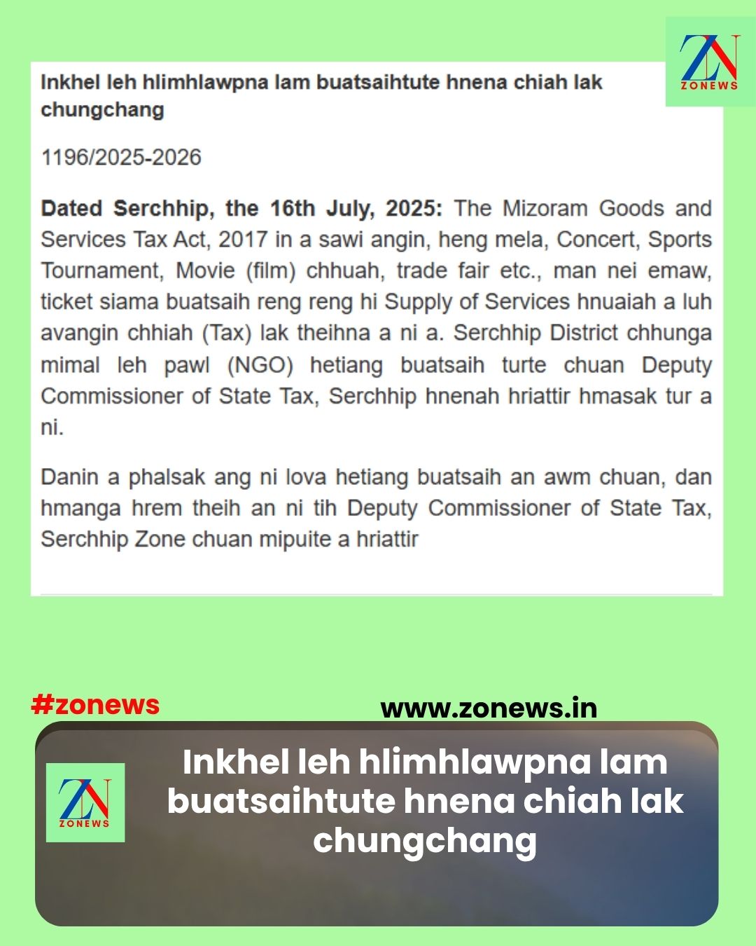 #ZONEWS July 16, 2025: The Mizoram Goods and Services Tax Act, 2017 in a sawi angin, heng mela, Concert, Sports Tournament, Movie (film) chhuah, trade fair etc., man nei emaw, ticket siama buatsaih reng reng hi Supply of Services hnuaiah a luh avangin chhiah (Tax) lak theihna a ni a. Serchhip District chhunga mimal leh pawl (NGO) hetiang buatsaih turte chuan Deputy Commissioner of State Tax, Serchhip hnenah hriattir hmasak tur a ni.