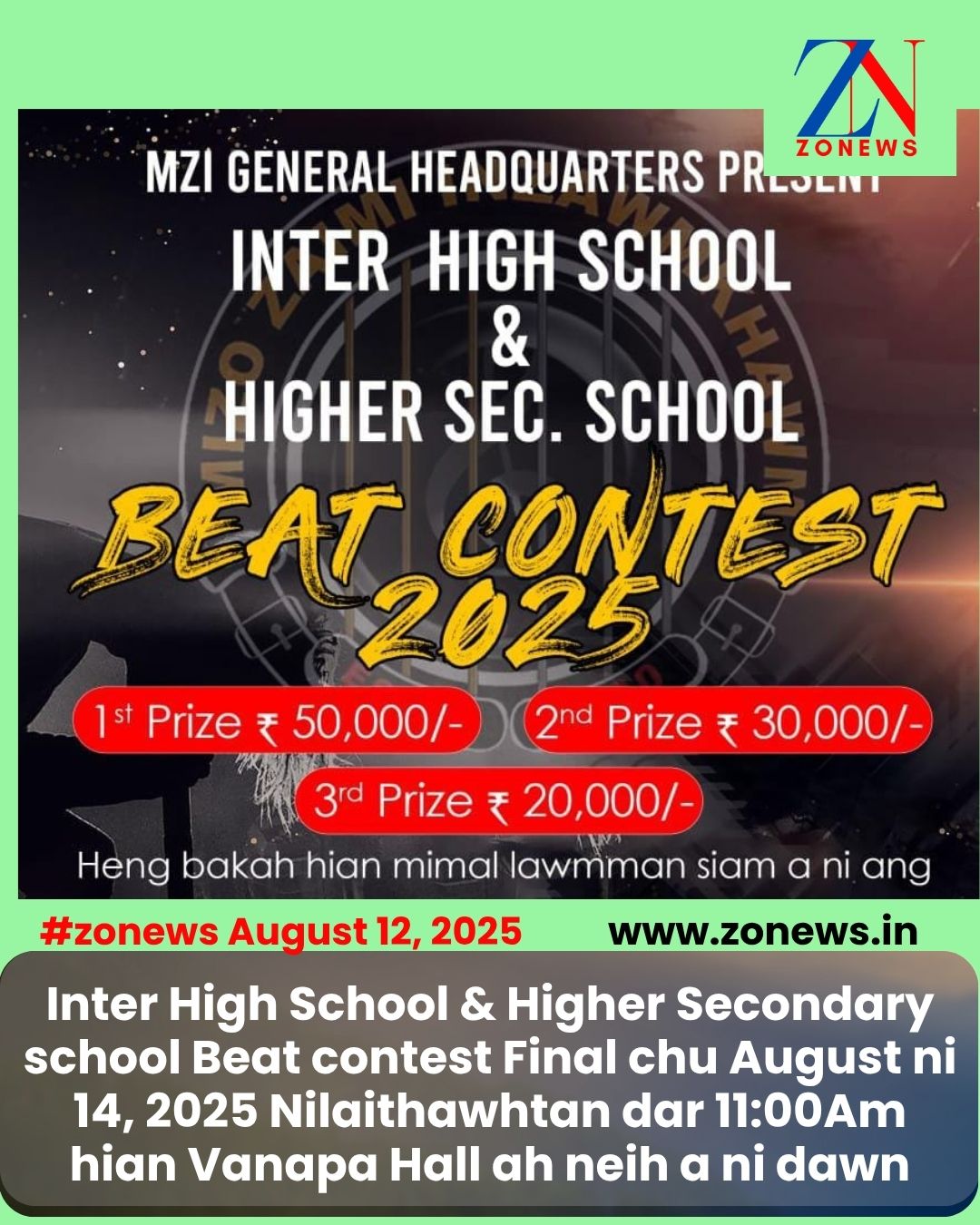 Inter High School & Higher Secondary school Beat contest Final chu August ni 14, 2025 Nilaithawhtan dar 11:00Am hian Vanapa Hall ah neih a ni dawn: Band 12 ten tha ber nih an inchuh ang.