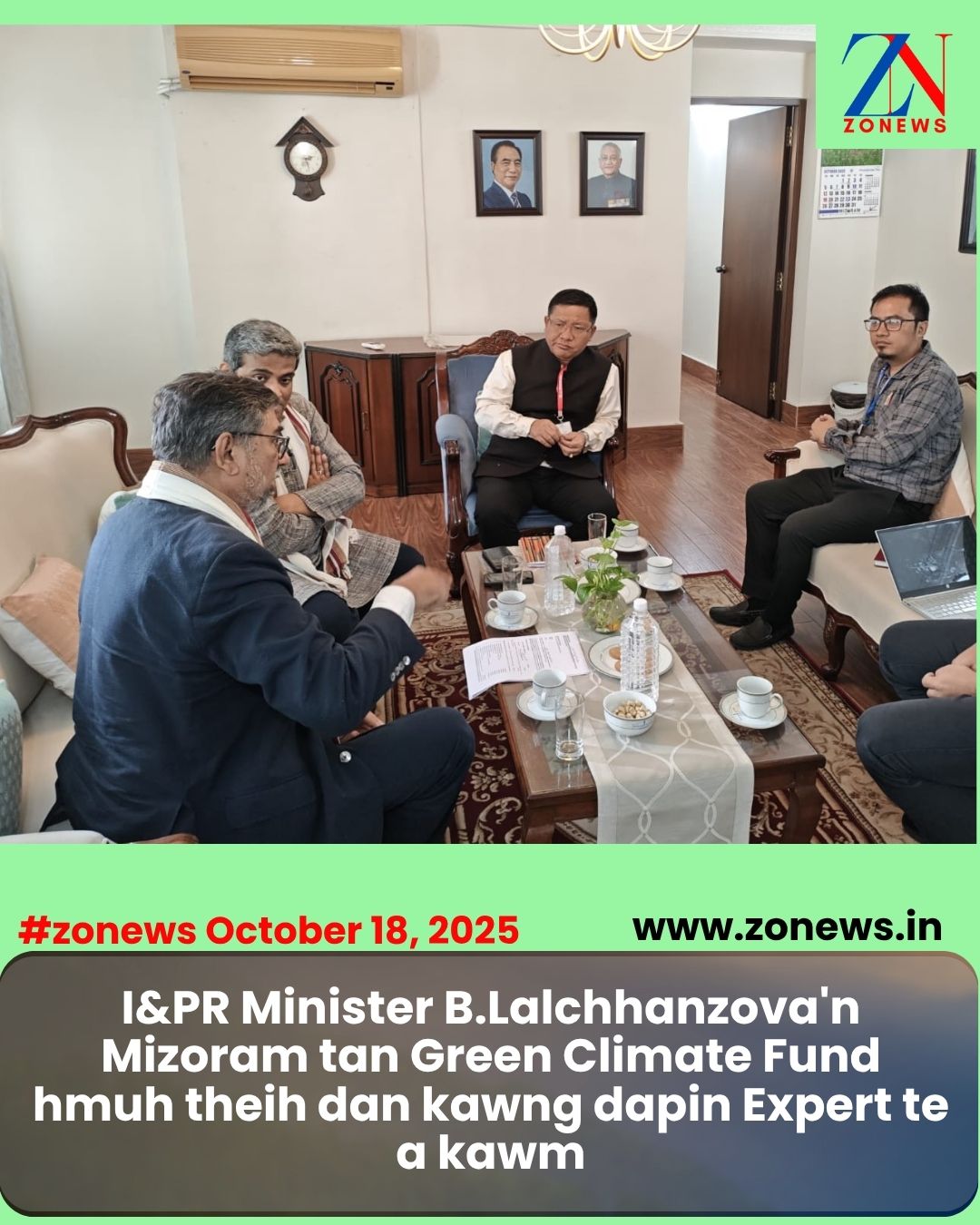 #ZONEWS Kolkata October 18, 2025: Vawiin khan I&PR Minister Pu B.Lalchhanzova chuan Kolkata Mizoram House, Salt Lake-ah Dr. Dipak Das Gupta, Climate Scientist, Ministry of Finance Govt of India a Principal Economic Adviser hlui leh Pu Joy Chakravarty te a kawm a. He hunah hian UNDP hnuaia  Green Climate Fund  chu Mizoramin a hman tangkai ve theih tur chungchang te an sawiho a ni.