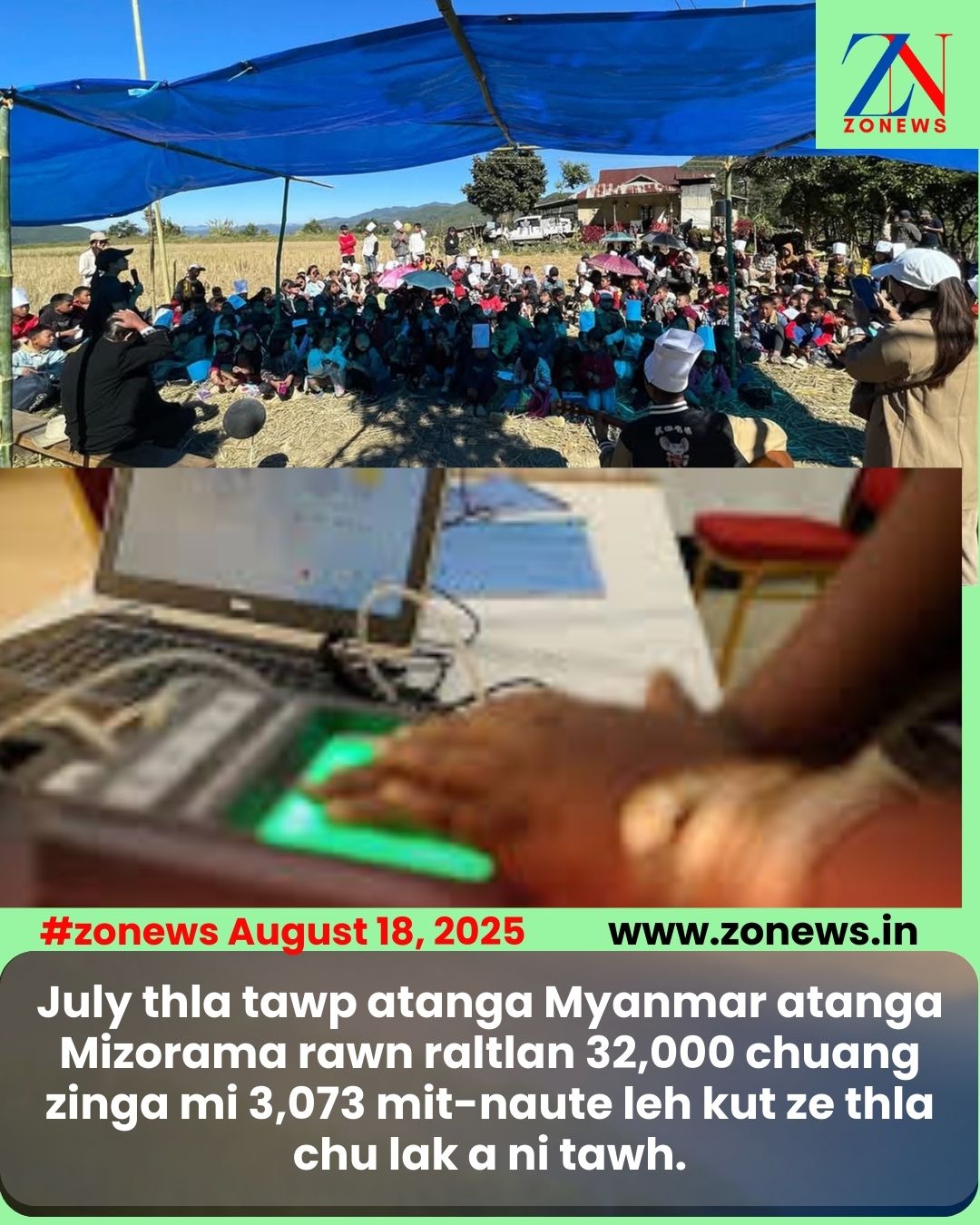 #ZONEWS August 18, 2025: July thla tawp atanga Myanmar atanga Mizorama rawn raltlan 32,000 chuang zinga mi 3,073 mit-naute leh kut ze thla chu lak a ni tawh.