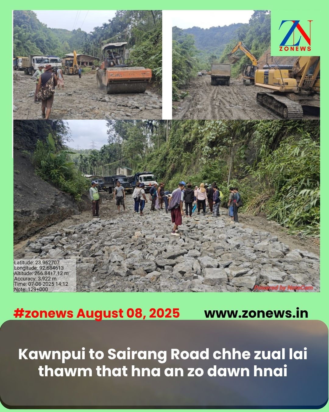 #ZONEWS Aizawl August 08, 2025 : Kawnpui to Sairang NH-06 thawm that hna thawh mekah a chhe nasa lai ber leh khawih harsa lai ber ni a ngaih Zoram Mega Food Park, Khamrang bul kawngpui chu nimin khan siam a ni a, a chhe lai hi metre 100 vel niin vawiin chawhnu dar 2:00 thleng khan metre 80 chu boulder a hnawhkhah a ni tawh a, vawiin hian zawhfel vek hman beisei a ni. Excavator 2, Vibratory Roller 1 leh Grader 1 hmanga hna thawh a ni a, kawngpui sir tawn tawnah tuihawk luankawr (side drain) tha taka hai a ni bawk ang.