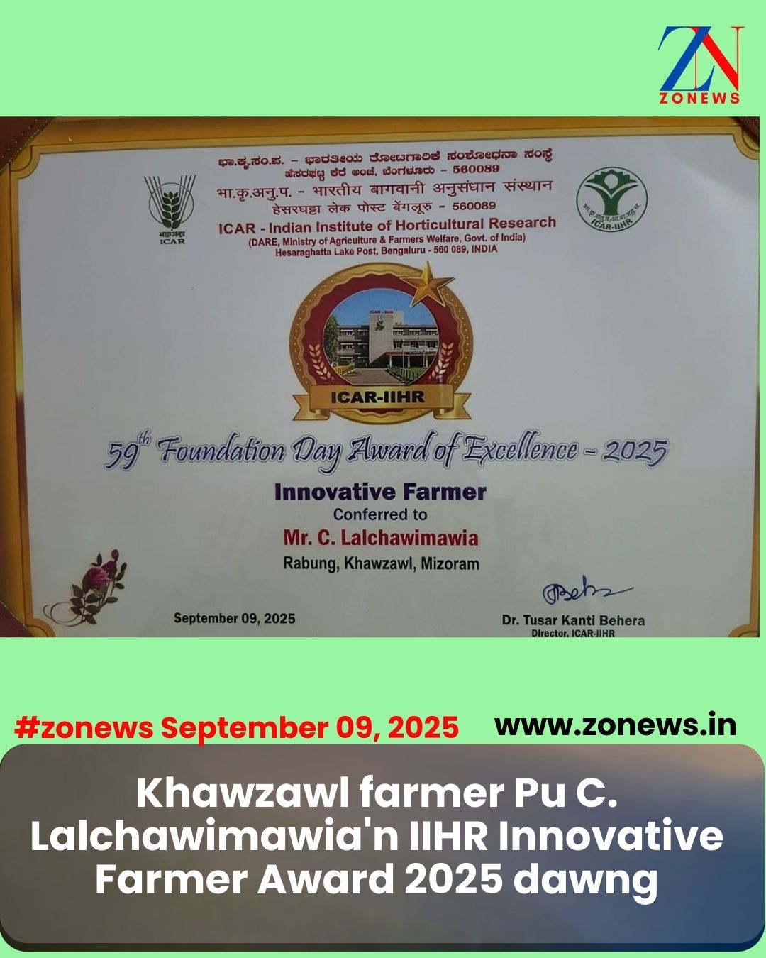 #ZONEWS Khawzawl September 09, 2025: Vawiin chawhma dar 10:00 khan Dr. G.S. Randhawa Auditorium, ICAR-Indian Institute of Horticultural Research, Hessarghatta Lake Post Bengaluru – ah Pu C.Lalchawimawia, Rabung khua chuan IIHR Innovative Farmer Award-2025 a dawng.
