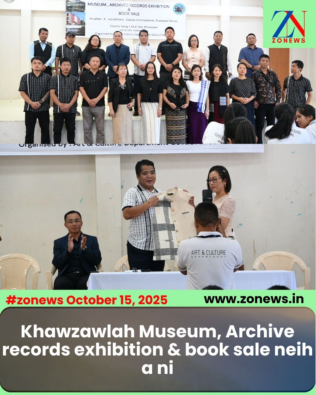 #ZONEWS Khawzawl October 15, 2025: Vawin chawhma dar 10 khan Electric veng YMA Hall-ah Art & Culture department Annual Working Program 2025-26 hnuaiah Exhibition & Book sale 2025 chu ni 15 leh 16 October 2025 chhunga neih tura buatsaih a ni a, Khawzawl Bawrhsap Pu K. Vanlalthiana chu a khuhhawnnaah khuallian a ni.