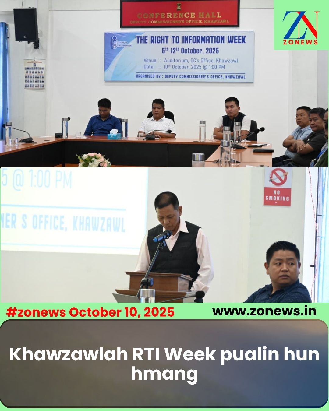 #ZONEWS Khawzawl October 10, 2025 : Vawiin khan Khawzael DC Conference Hall-ah RTI (Right to Information) Week pualin hun hman a ni a, Bawrhsap Pu K. Vanlalthiana chu khuallian a ni.