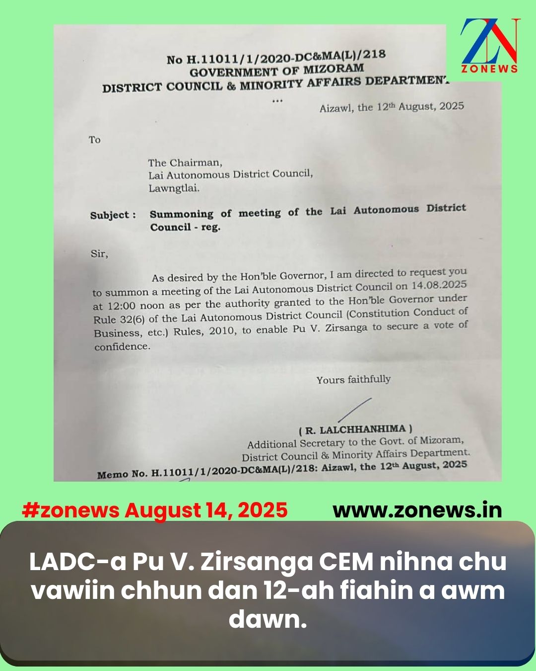 #ZONEWS #POLITICS LAWNGTLAI August 14, 2025: Mizoram Governor thupekin vawiin chhun dar 12 hian Lai Autonomous District Council (LADC)-a CEM Pu V. Zirsanga kaihhruai sawrkar chu fiahin a awm dawn a. Ro an la rel zui zel thei dawn em tih vawiin hian a chiang dawn a ni.