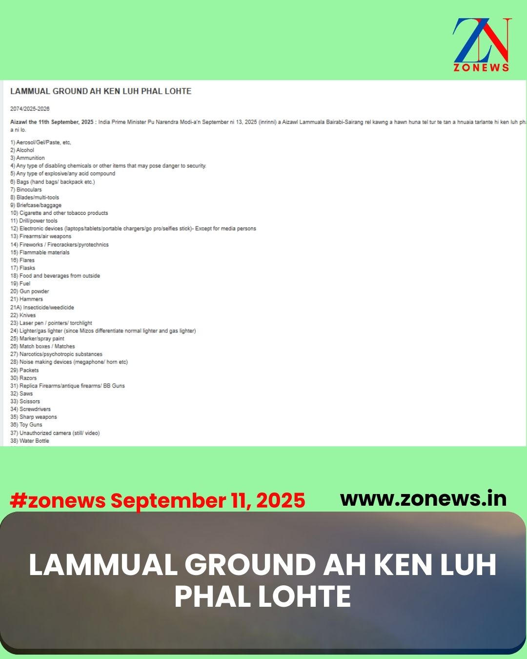#ZONEWS Aizawl September 11, 2025 : India Prime Minister Pu Narendra Modi-a’n September ni 13, 2025 (inrinni) a Aizawl Lammuala Bairabi-Sairang rel kawng a hawn huna tel tur te tan a hnuaia tarlante hi ken luh phal a ni lo.