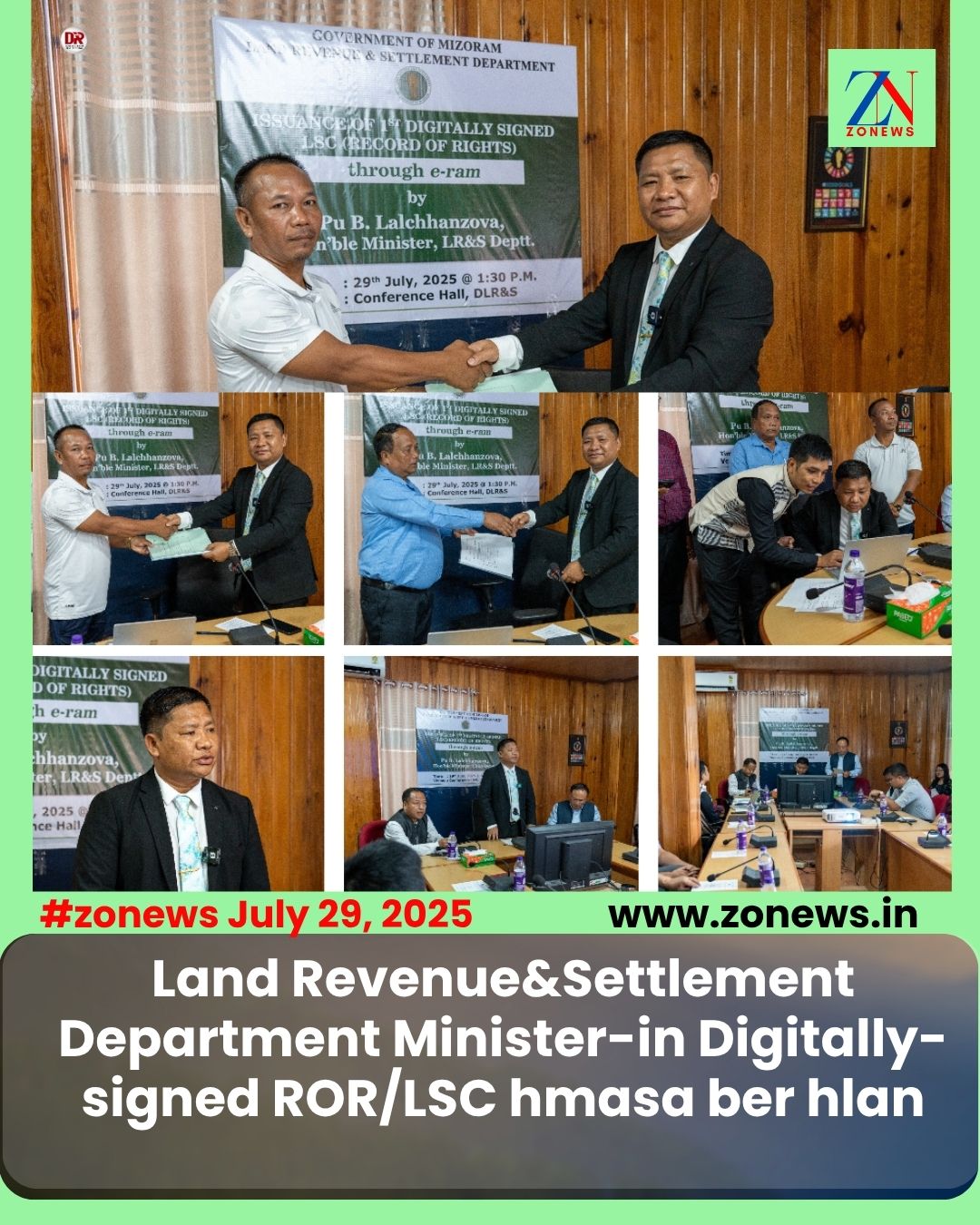 #ZONEWS Aizawl July 29, 2025: Vawiin khan Land Revenue&Settlement Department changtu Minister Pu B. lalchhanzova chuan Directorate of Land Revenue&Settlement Conference Hall, Aizawlah, LR&S Department hnuaia e-RAM portal kaltlanga Digitally-signed ROR (LSC) hlanna hun chu khuallian niin a hmanpui.