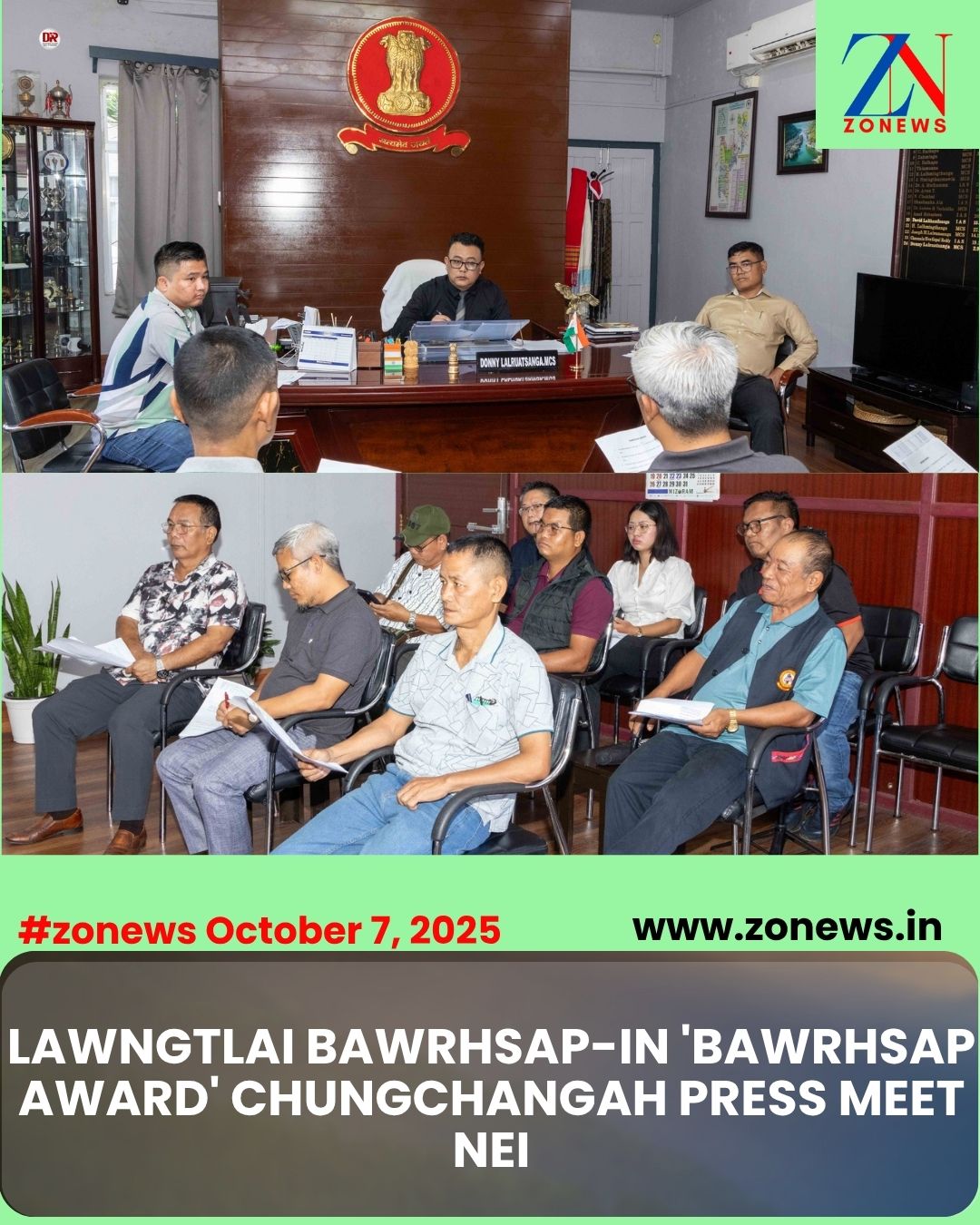 #ZONEWs Lawngtlai October 7, 2025: Vawiin khan ‘Bawrhsap Award’ chungchangah Pu Donny Lalruatsanga, Lawngtlai Bawrhsap chuan Press Meet- a Office Chamber-ah a nei a. Pu H. Zonunmawia, PD (DRDO) chuan Bawrhsap hi a tawiawm a ni.