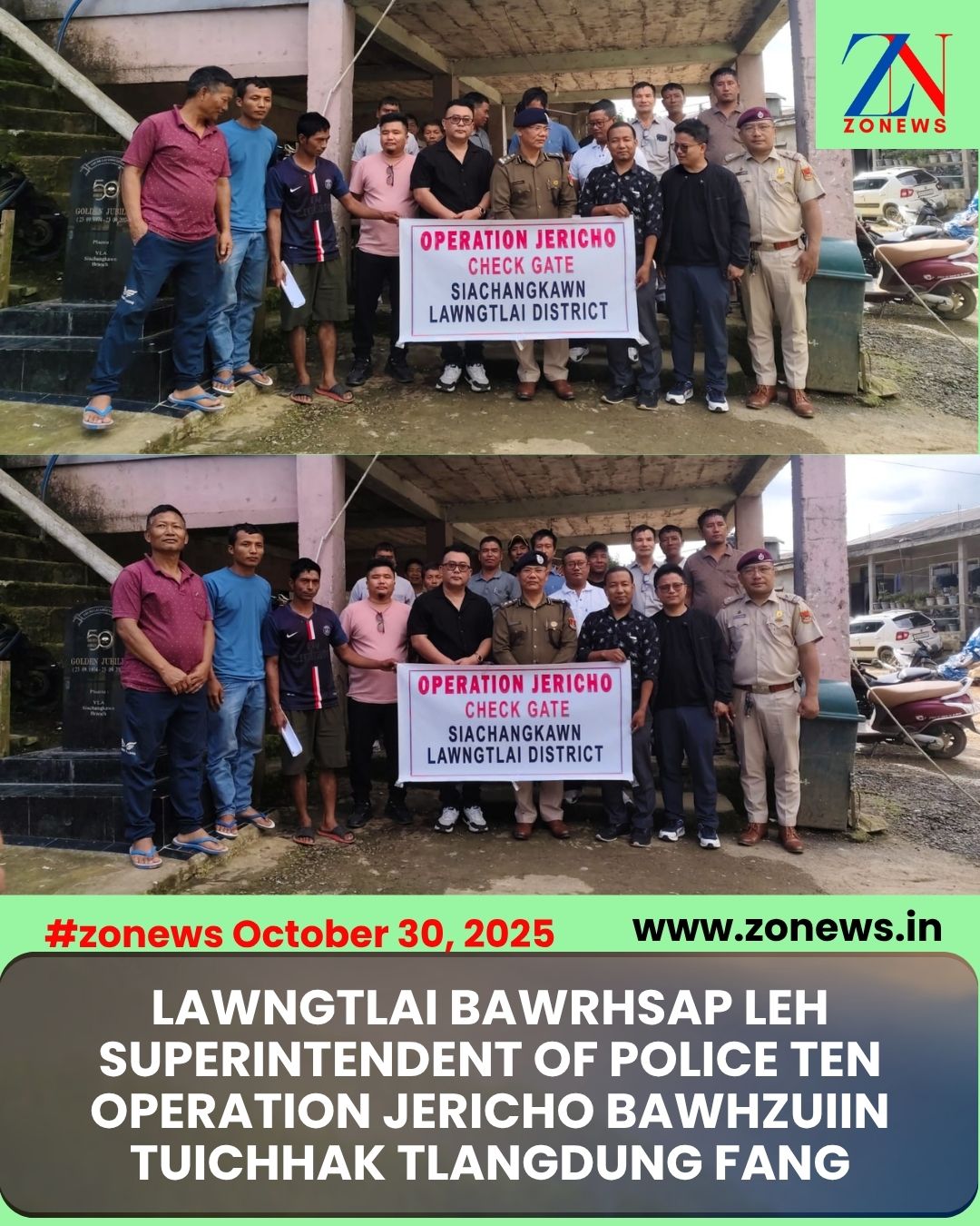 #ZONEWS Lawngtlai October 30, 2025 : Vawiin khan Pu Donny Lalruatsanga, Lawngtlai Bawrhsap leh Pu PC Lalchunglura, Superintendent of Police, Lawngtlai te chuan ‘Operation Jericho’ bawhzuiin tuichhak tlangdunga ‘duty post’ an fang a. Khawtlang hruaitu- VC leh YLA,LWA ten an lo dawngsawng a ni.