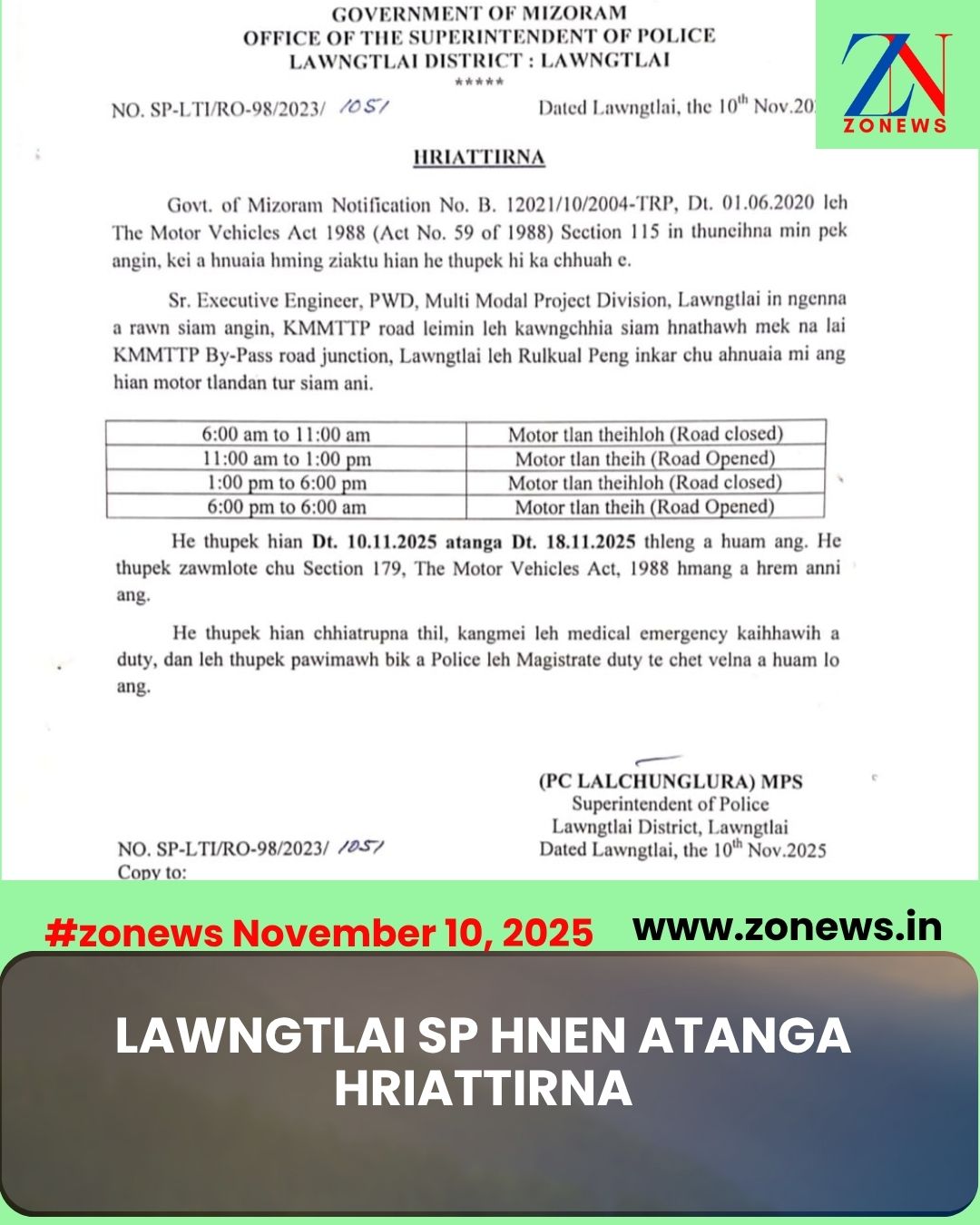 #ZONEWS Lawngtlai November 10, 2025 : KMMTP Road leimin leh kawngchhia siam hnathawh mekna lai KMMTTP By-Pass road junction, Lawngtlai leh Rulkual Peng inkar siam chungchangah Superintendent of Police, Lawngtlai chuan a hnuaia mi ang hian hriattirna a tichhuak.