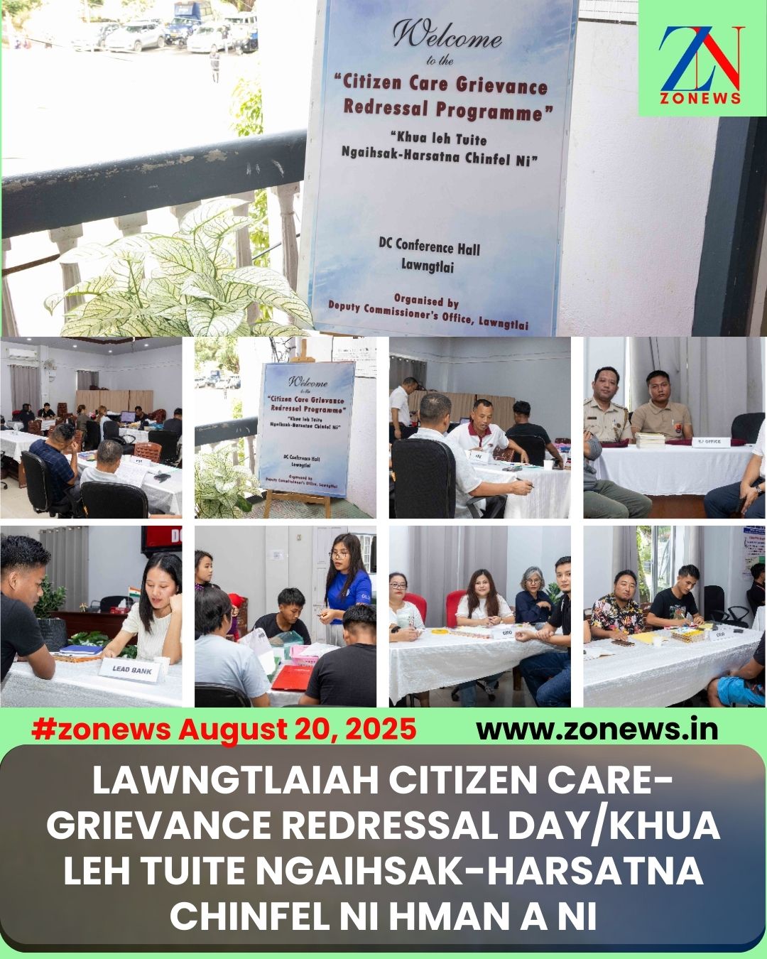 #ZONEWS Lawngtlai August 20, 2025 : Deputy Commissioner’s Office, Lawngtlai District bultuma ‘Citizen Care- Grievance Redressal Day’ (Khua leh tuite Ngaihsak-Harsatna Chinfel Ni) hman lo nitawh thin chu vawiin khan DC Conference Hall- ah  hman leh  a ni a. Zing dar 10:30 AM atanga tlai lam dar 5:00 PM  thlengin sawrkar department hrang hrangte chu mipuite dawr theihin an inpho chhuak a ni.